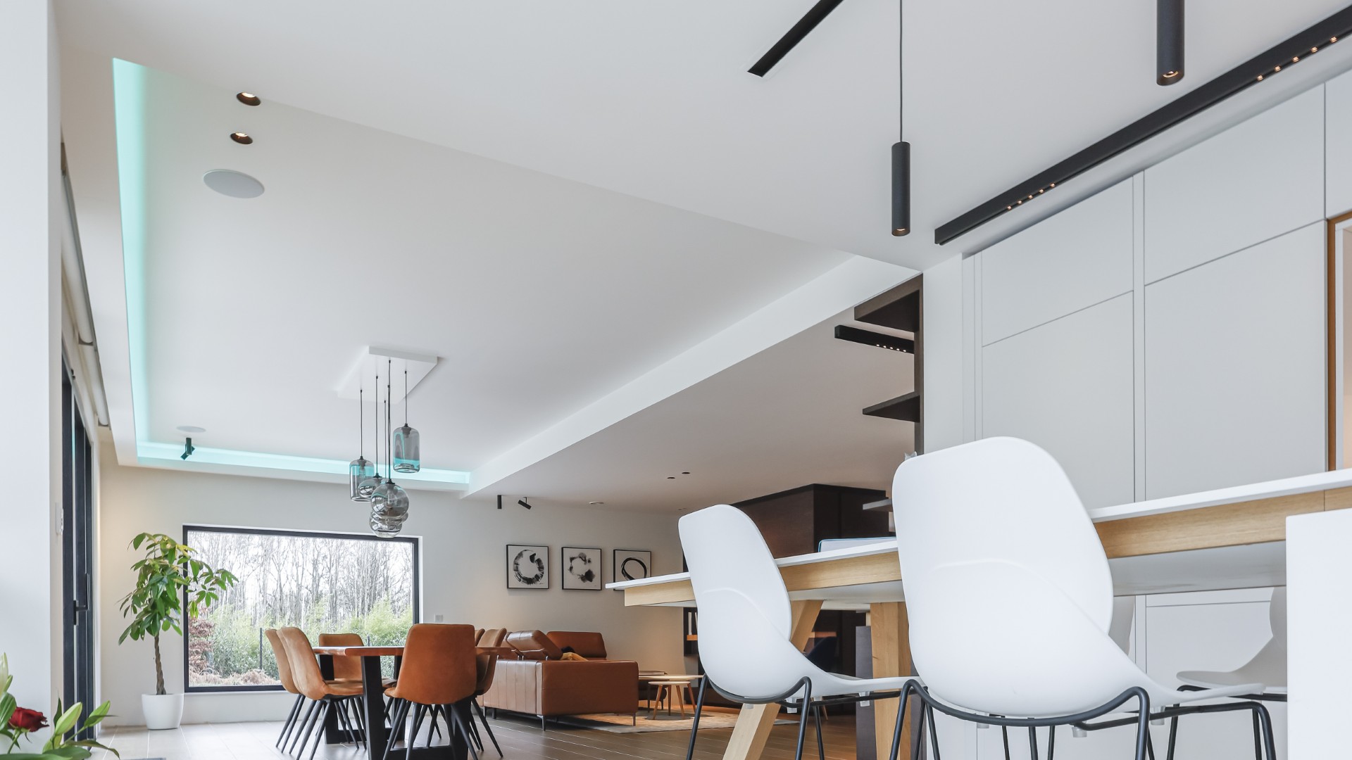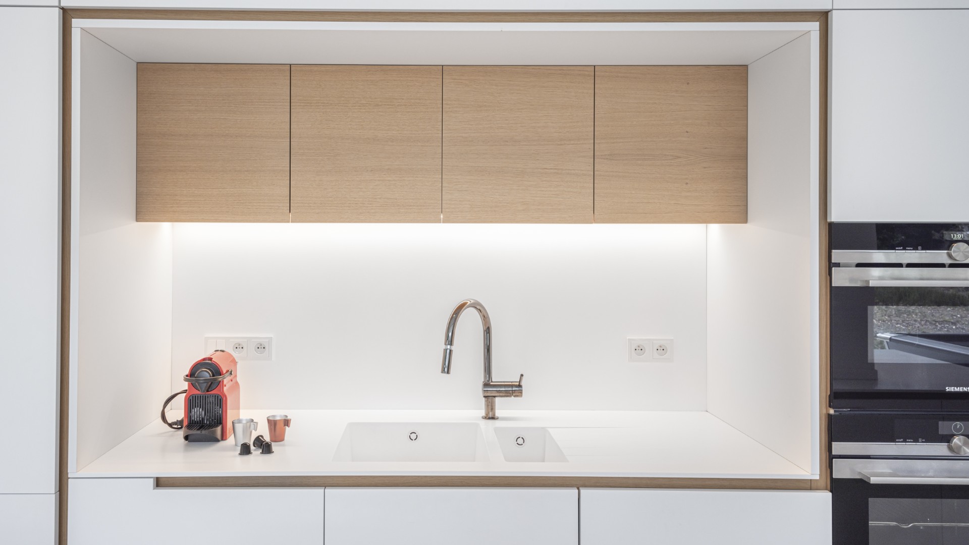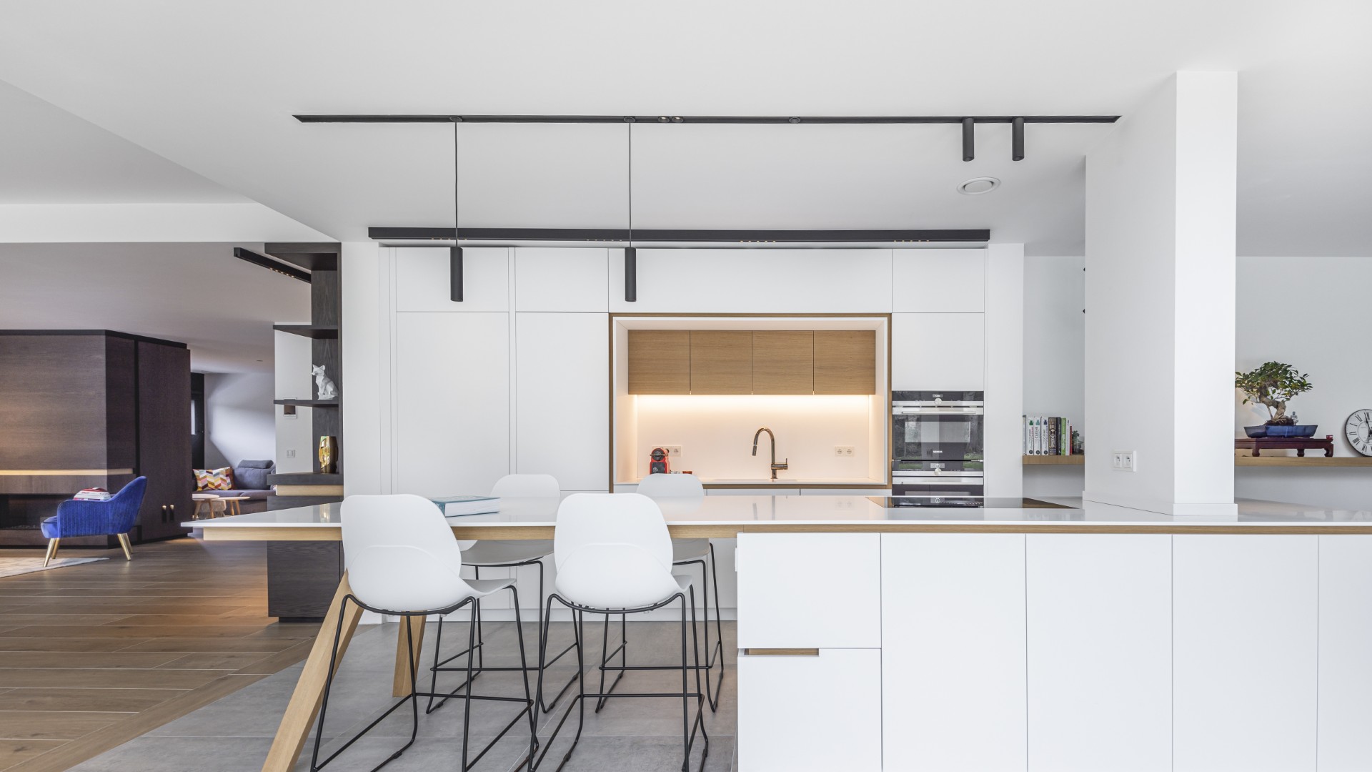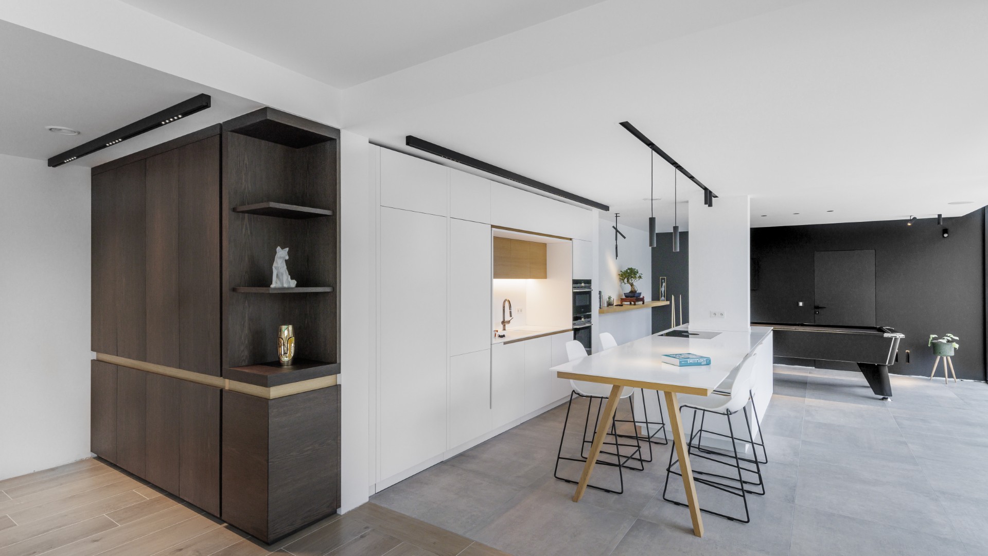 Nos équipes ont pris en charge l’aménagement de cet espace vaste et lumineux. Le chêne, naturel ou foncé, et le stratifié blanc s’allient en toute harmonie. Ce choix de matériaux rappelle avec élégance le séjour.
