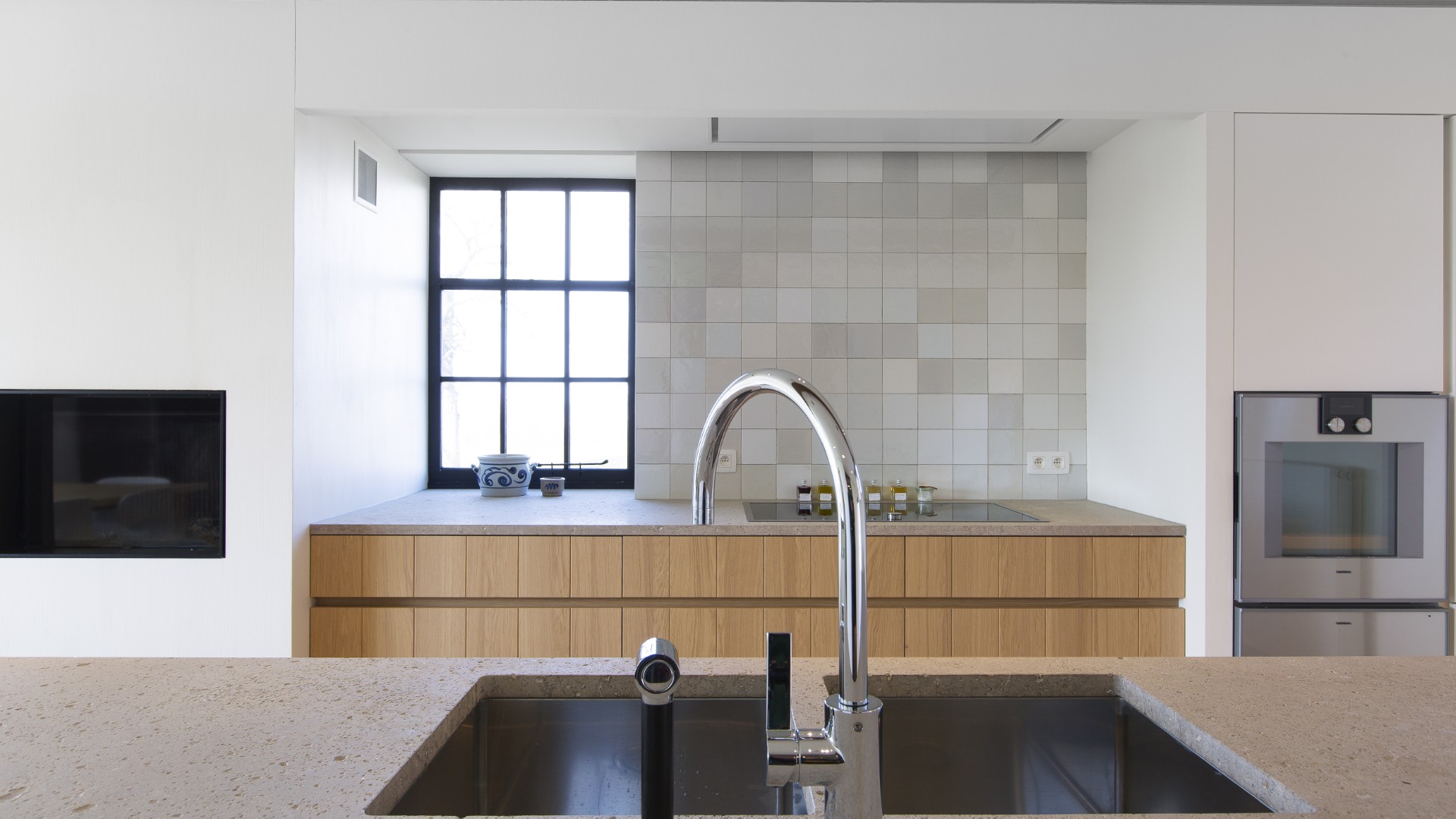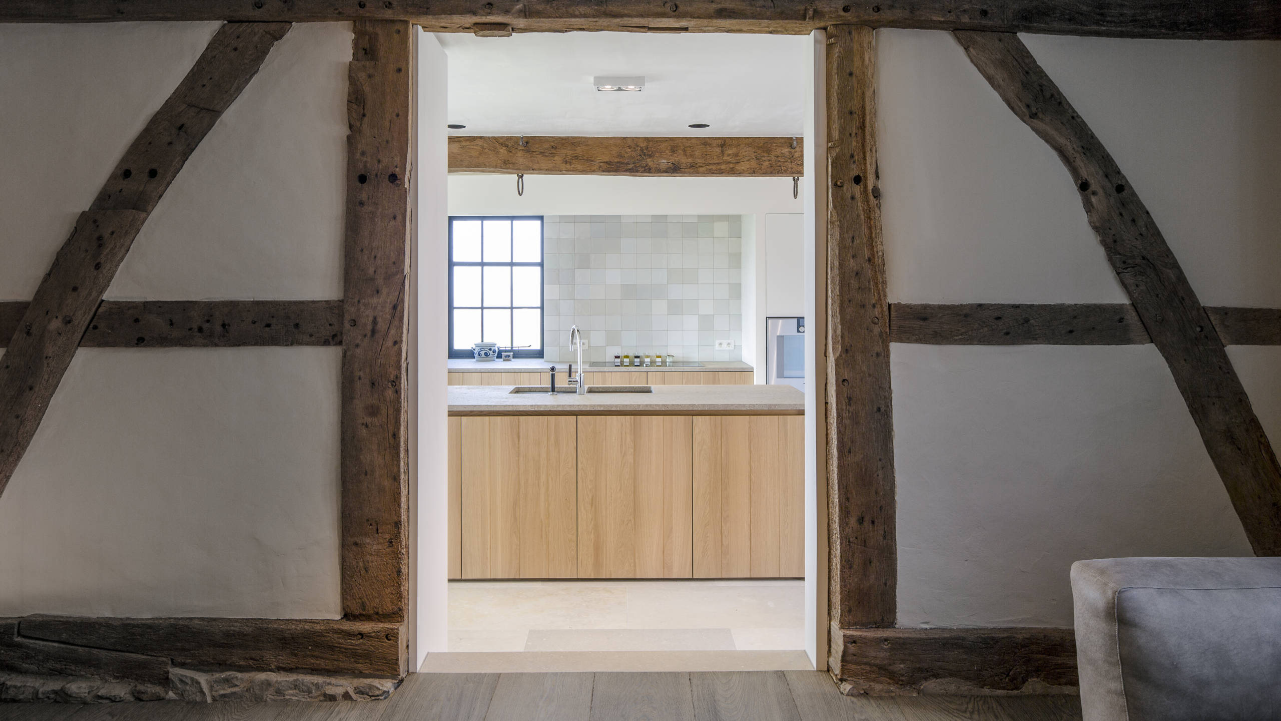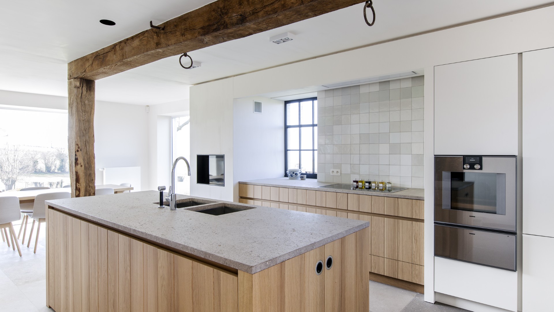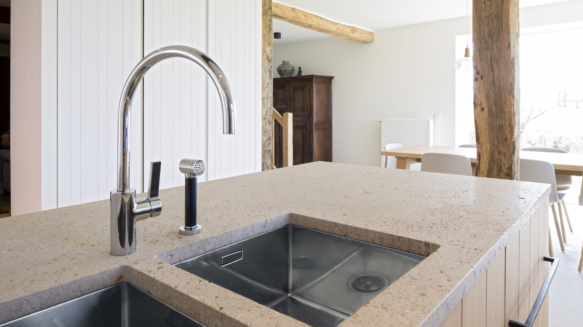Les matériaux choisis pour ce projet allient caractère et élégance. Le chêne massif rainuré est sublimé par un travertin Pietra di Medici, tant sur les plans de travail qu’en dalles au sol. Les carreaux, dans un esprit ancien et pourtant parfaitement neufs, finissent de lier l’ensemble. Les poutres apparentes donnent encore davantage de charme à cette cuisine à la croisée de l’authenticité et de la modernité.