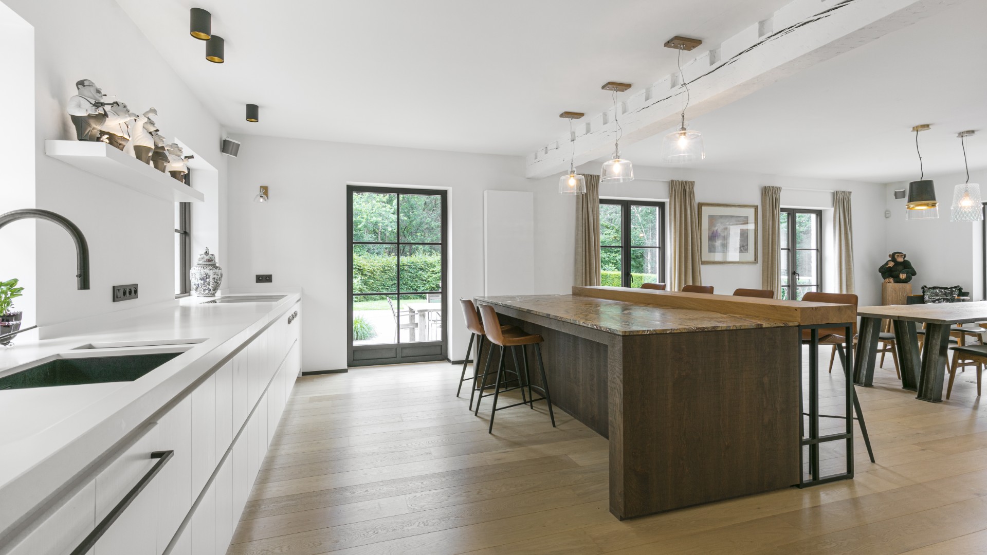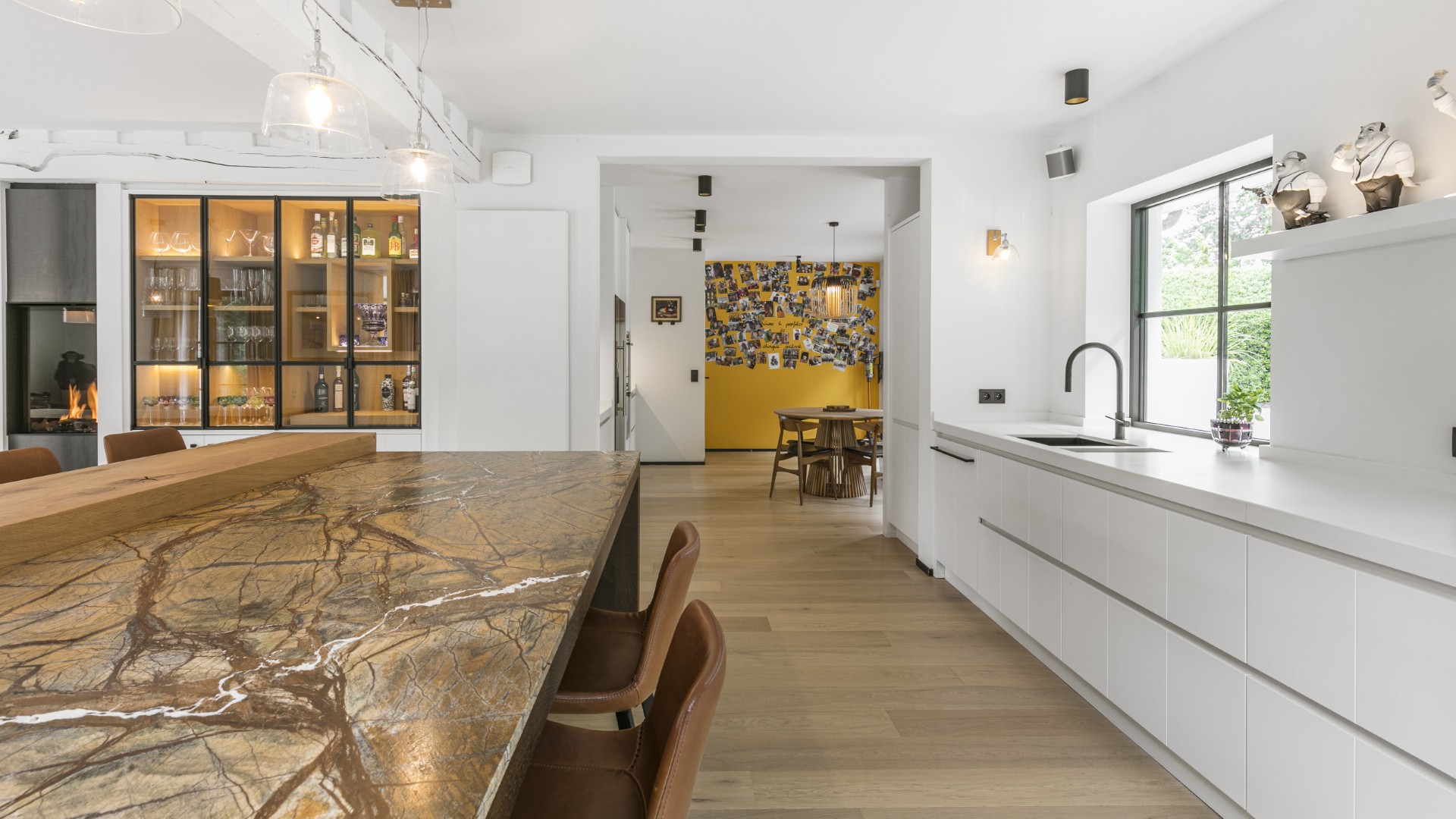 Cette cuisine a été aménagée en deux zones. Dans l’arrière-cuisine ont été dissimulés les fours et frigos, pour conserver l’élégance de la pièce principale. Ainsi, celle-ci contient essentiellement la zone de cuisson, composée d’un système Bora équipé d’un Teppanyaki. En son cœur trône un bar central, qui accueille d’un côté des chaises hautes et, de l’autre, un ilot. Le chêne massif teinté se mêle au chêne industriel et épouse un marbre de caractère.