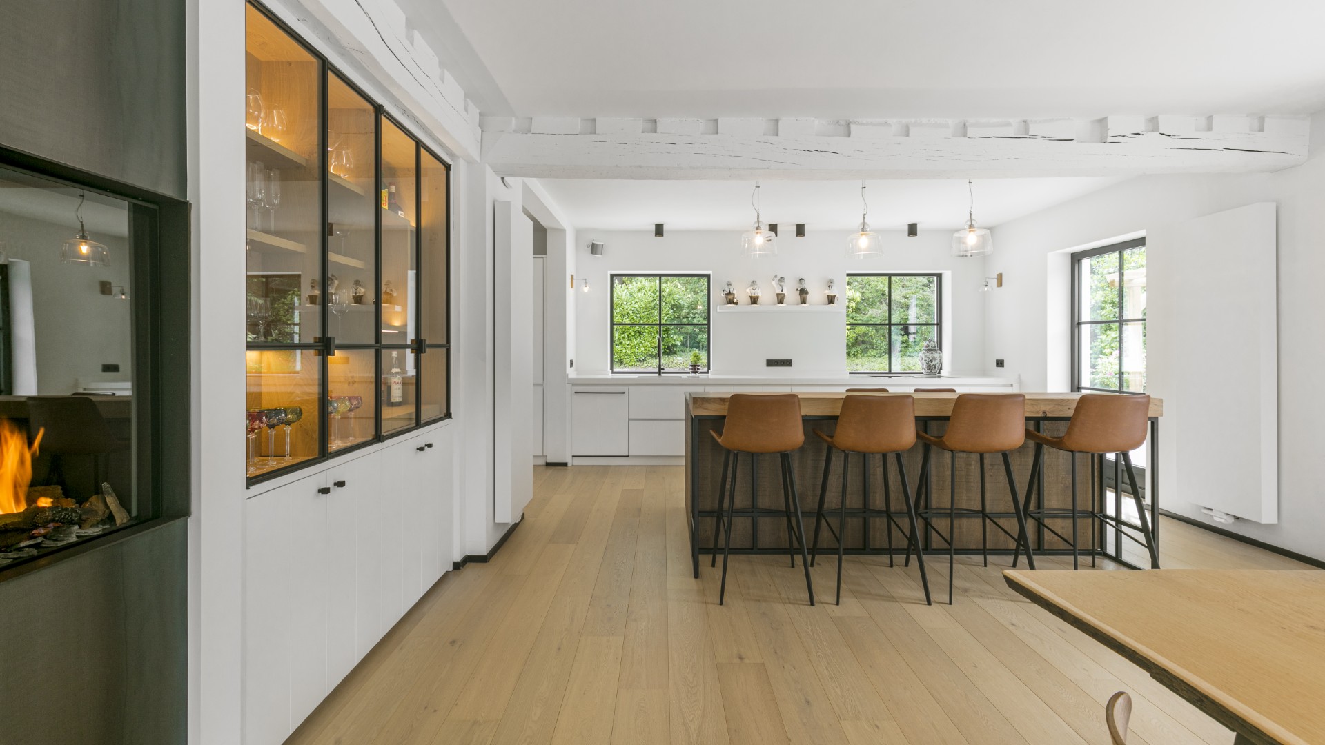 Accolés à la cuisine, nous avons également réalisé le mobilier sur-mesure entourant le feu ouvert et s’intégrant parfaitement sous les poutres anciennes de la maison.