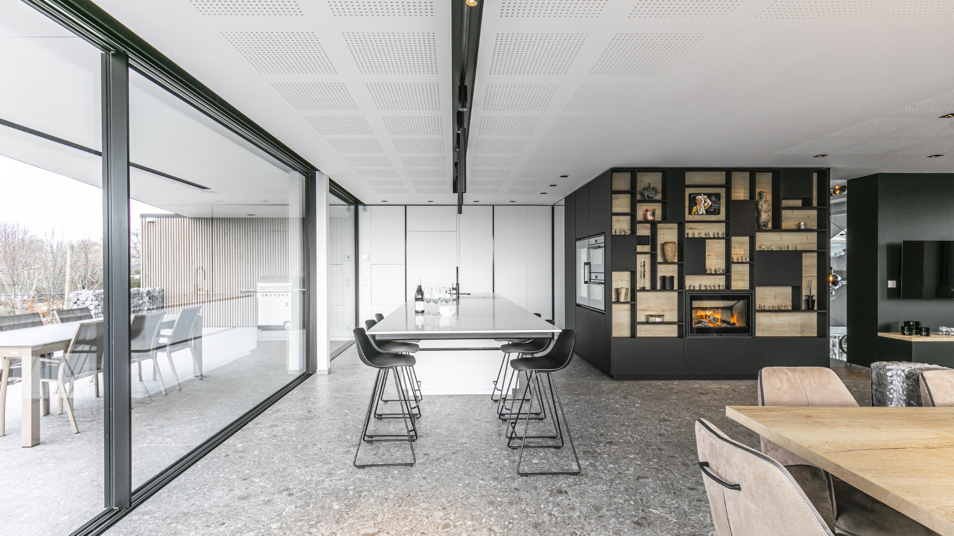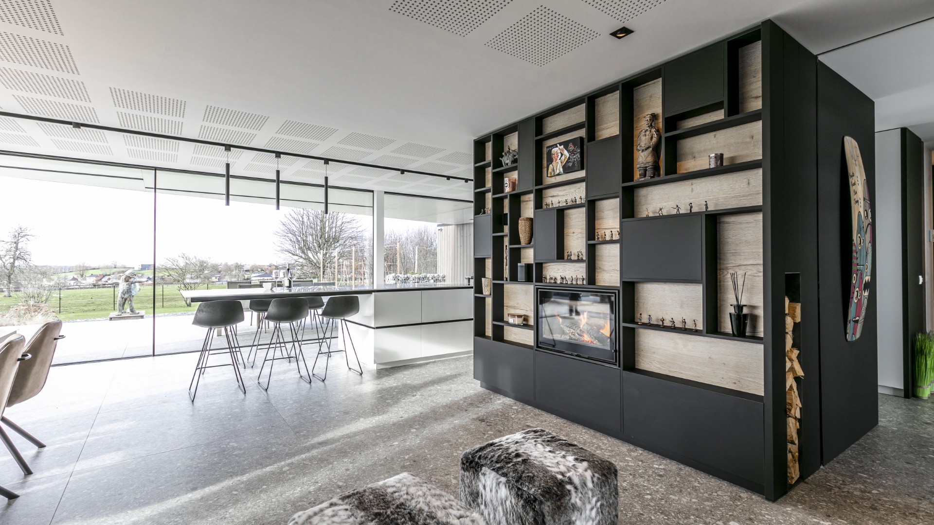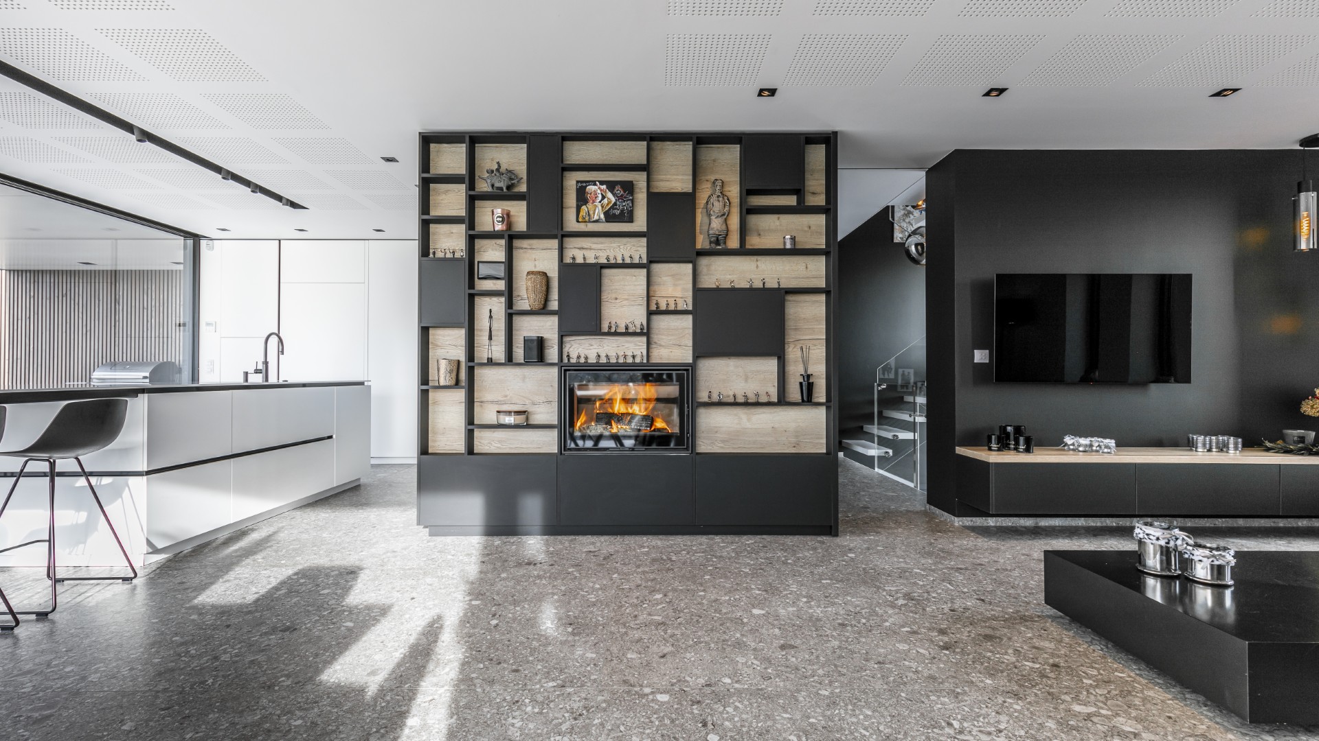 Nos équipes ont conçu et créé l’intégralité du mobilier du salon. Avec, en son centre, une boîte autour du feu encastré qui délimite réellement l’espace. Chaque pan de ce bloc est étudié : d’un côté, on retrouve une bibliothèque enserrant le feu. De l’autre, côté cuisine, les fours et la cave à vin habillent le mobilier. Sur la dernière face s’intègre à merveille un rangement à bûche, mais aussi des portes intégrées et coulissantes grâce à des rainure au plafond. Le fénix noir et le stratifié bois chêne offrent un rendu visuel aussi structurant qu’esthétique, démontrant d’un travail d’ébénisterie avancé. Le rappel de ces matières et couleur, jusque dans les meubles sous la télévision, termine d’habiller l’espace d’élégance et de caractère.
