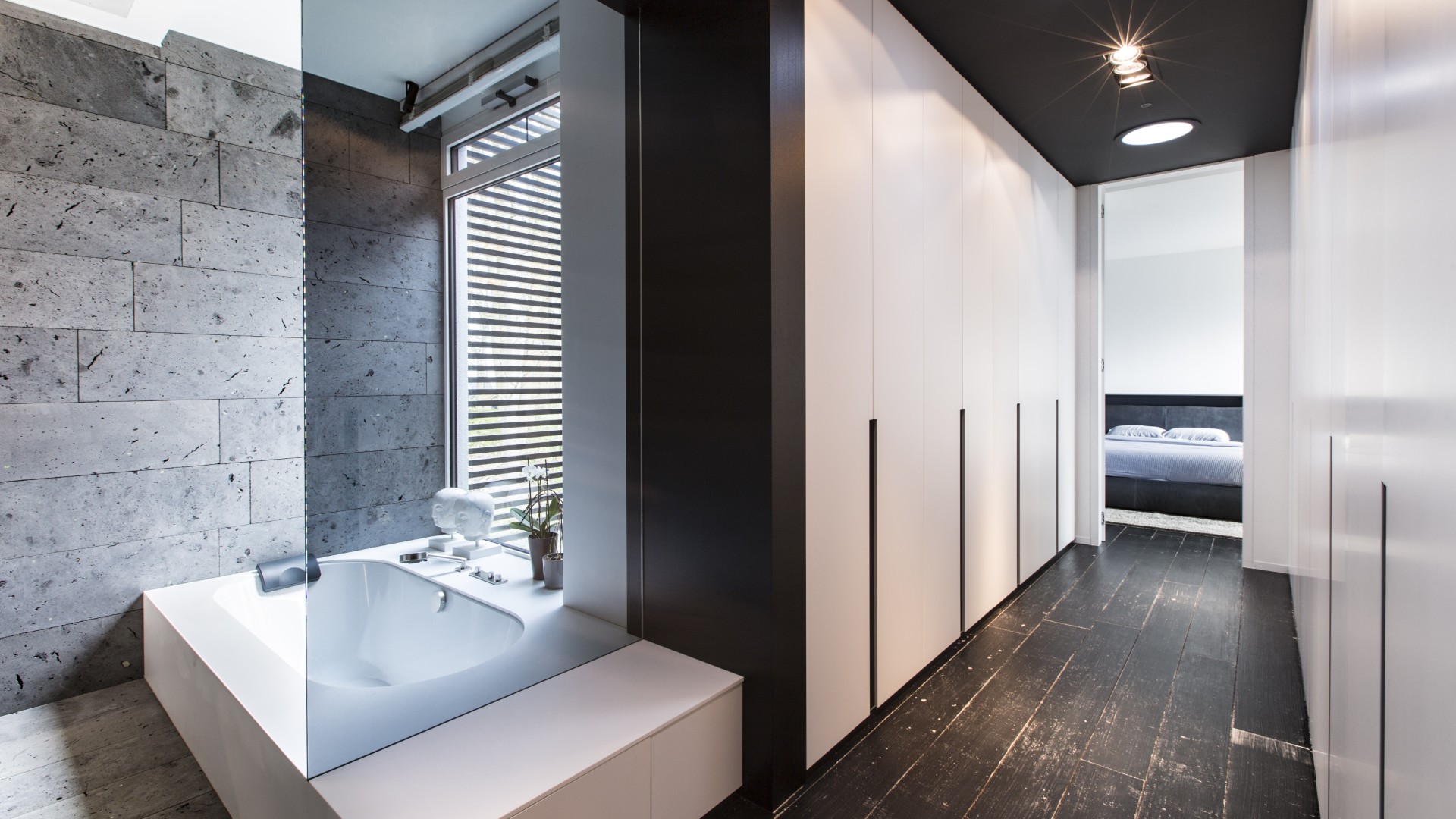 Dans le hall d’entrée, un placard vestiaire va du sol au plafond de la maison, tant pour optimiser l’espace que l’habiller d’élégance.