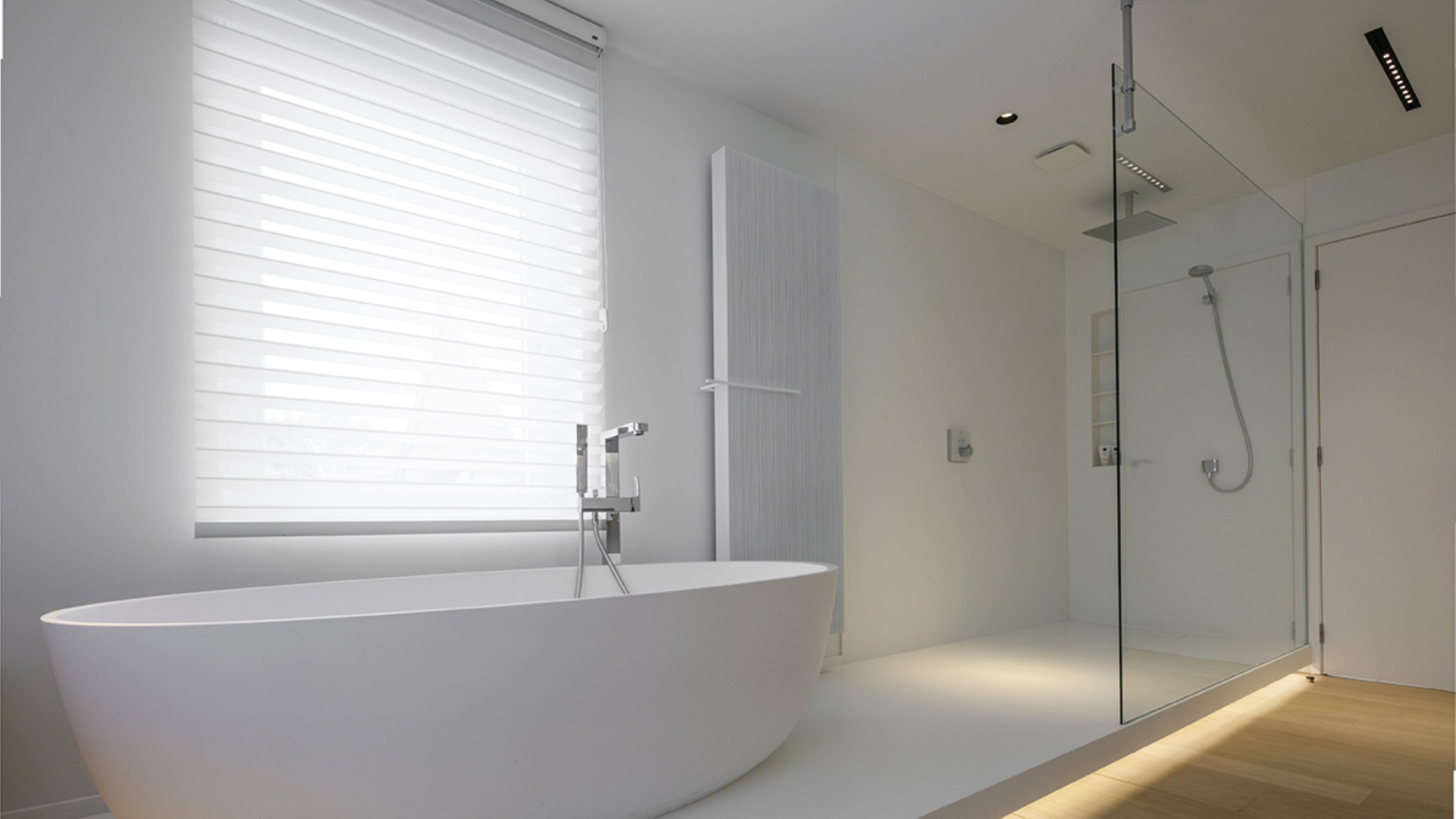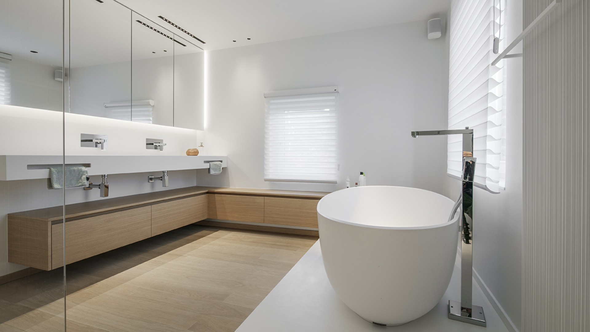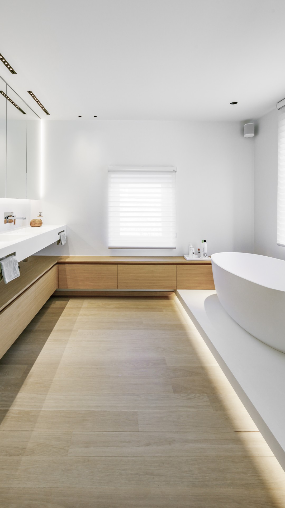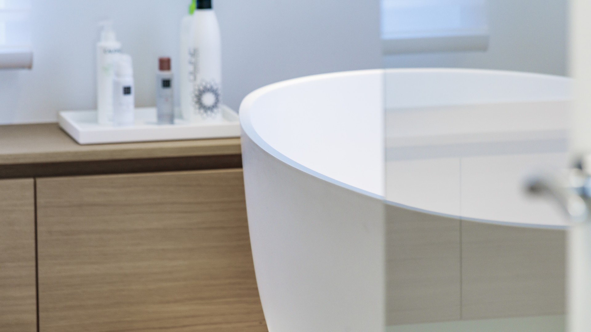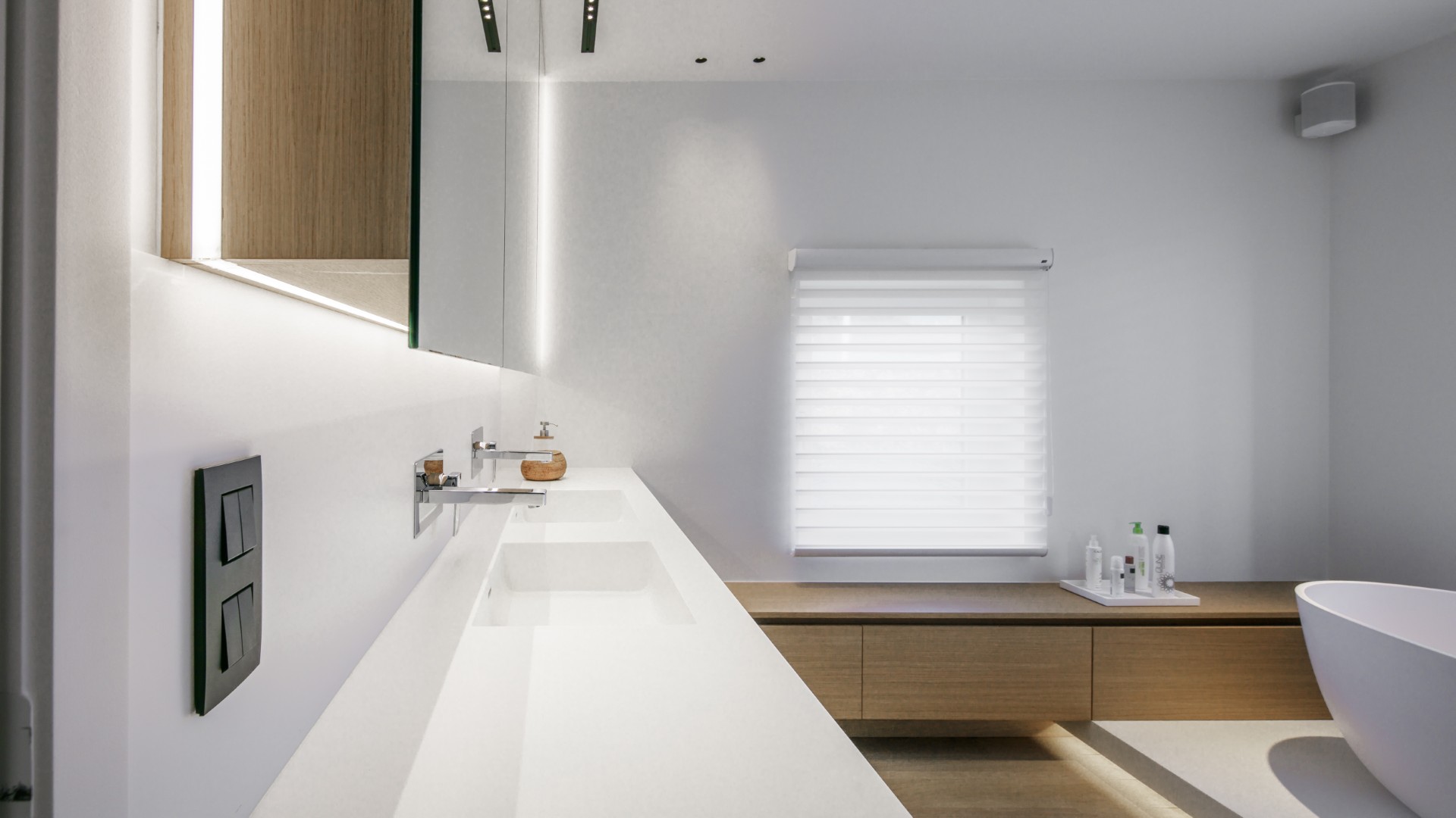 La matière privilégiée pour le lavabo, la baignoire ainsi que le tub de douche n’est autre que le Corian. Ses avantages :  pur, doux et très lumineux, aucun joint apparent, mais aussi résistant, durable et facile d’entretien.