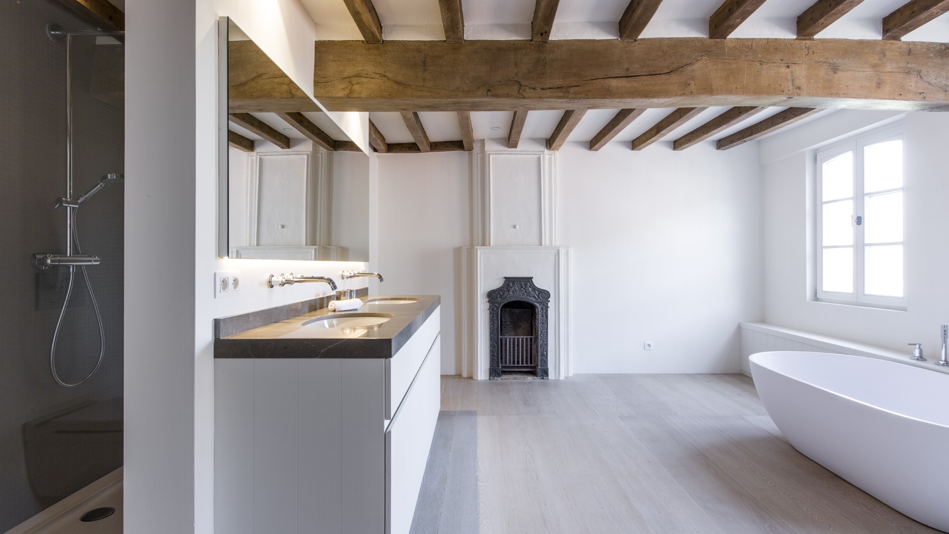 La rénovation de cette ferme ancienne s’est prolongée dans la salle de bain. La volonté des propriétaires restait de conserver les vieilles boiseries, tout en les sublimant avec du mobilier sur-mesure épuré.