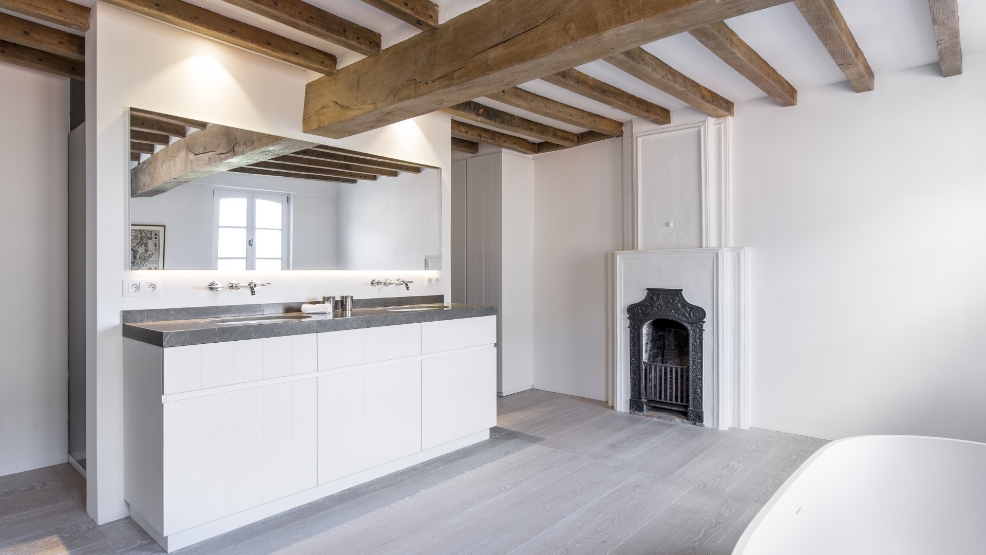 La création sur-mesure d’un mobilier épuré, dans le respect total du charme d’origine des lieux. Poutres apparentes et cheminée d’époque côtoient du mobilier laqué cordé et du marbre de caractère, qui assure tant l’esthétisme que les fonctions techniques de la pièce d’eau.