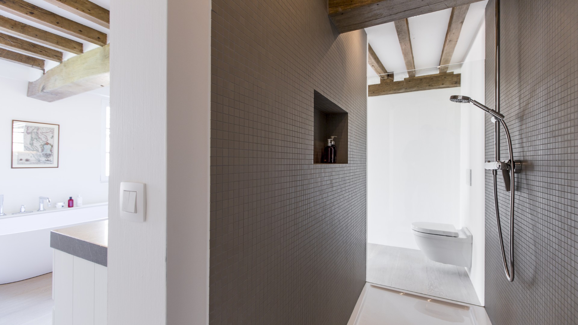 L’aménagement de cette salle de bain a commencé par la création d’une cloison, permettant tant de délimiter l’espace que d’amener toutes les techniques et arrivées d’eau. Elle soutient d’une part le mobilier de lavabo, avec un grand miroir reflétant parfaitement le dessin des poutres et, d’autre part, l’espace de douche ouvert pour davantage de lumière. En face, du côté de la baignoire, un caisson mural permet la même fonction : amener les techniques en toute discrétion.