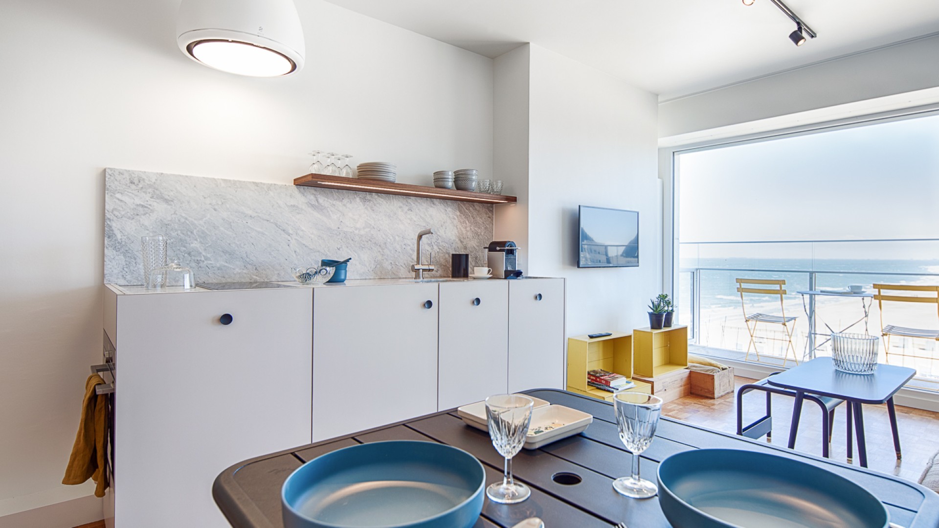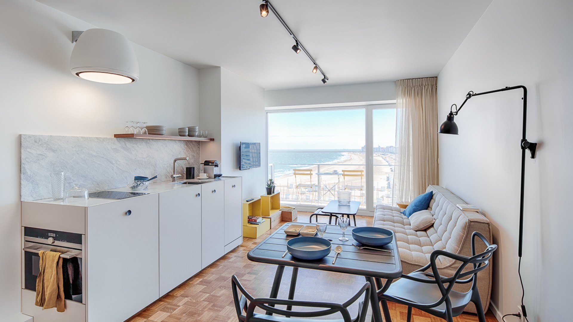 Le défi de ce projet résidait dans l’aménagement d’un studio à l’espace réduit (35m²), contenant tous les espaces d’un logement. Le tout sans sacrifier la vue ou la luminosité propres à sa localisation en bord de mer.