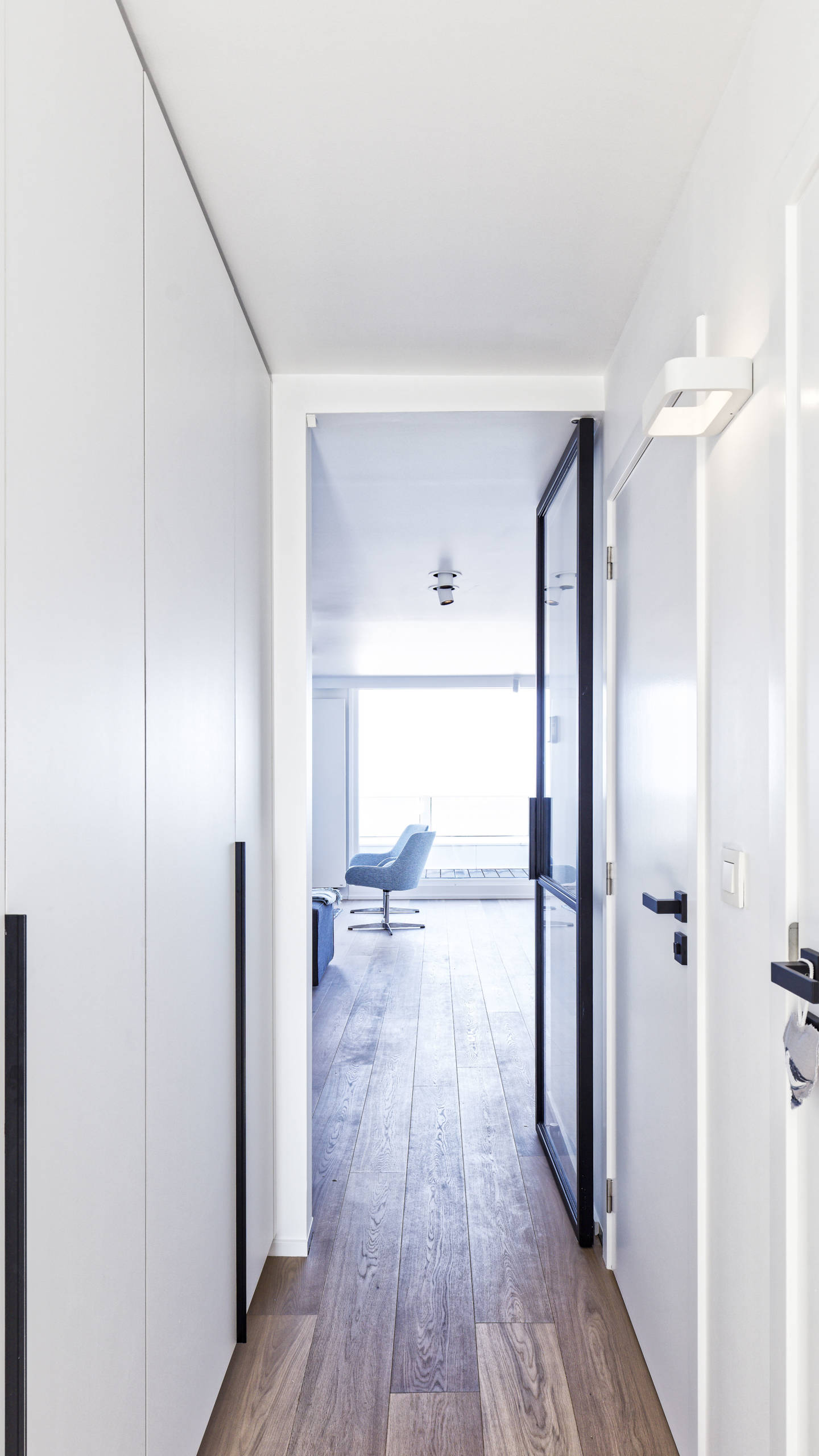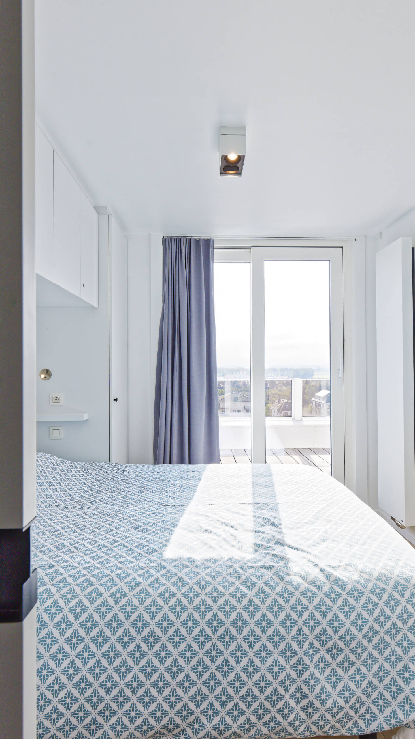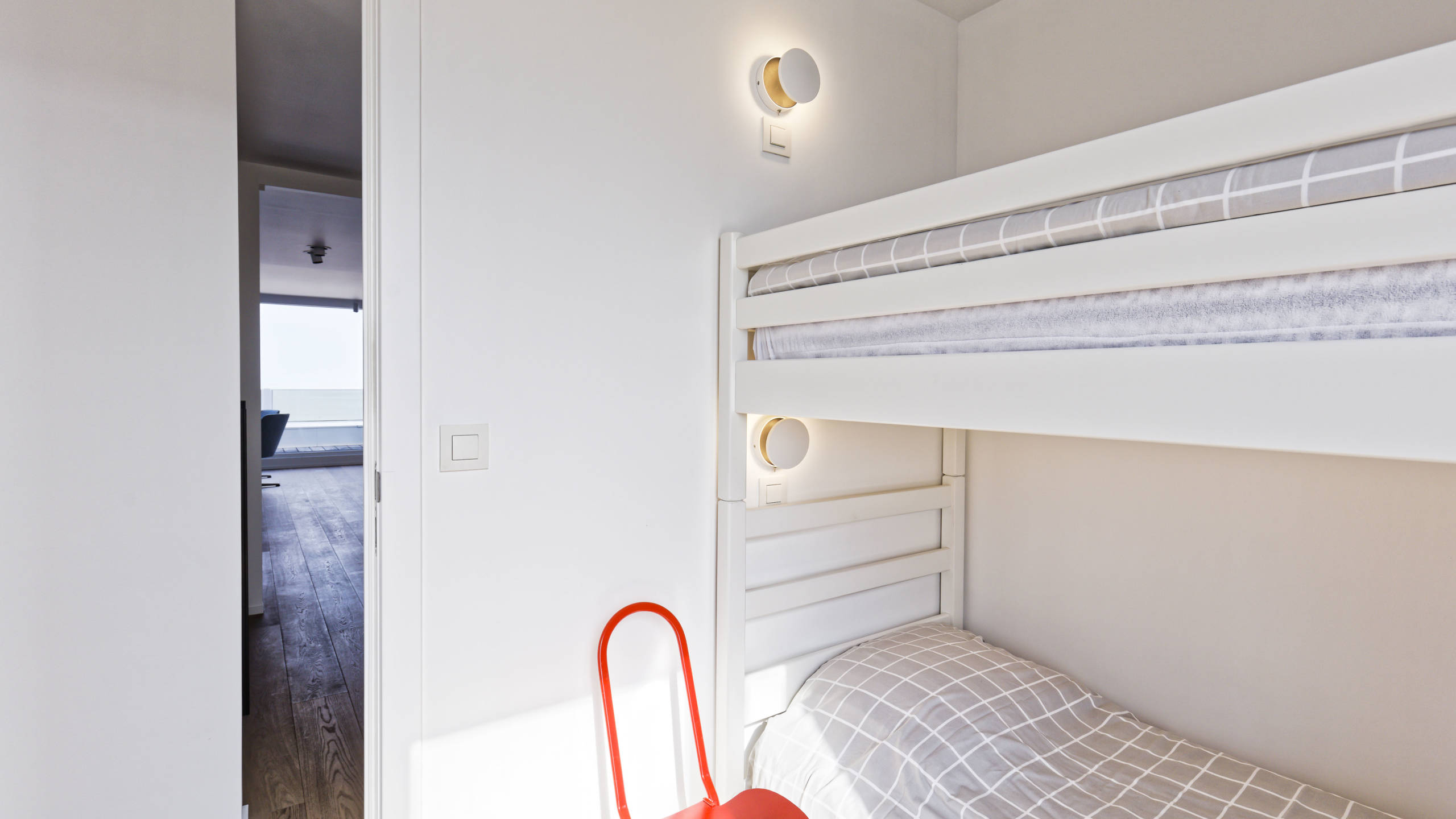 Un travail important a été réalisé au niveau des espaces, afin de les ouvrir sur le paysage. L’air marin semble imprégner cet appartement sur la cote grâce à ses espaces de vies ouverts et accueillants.
