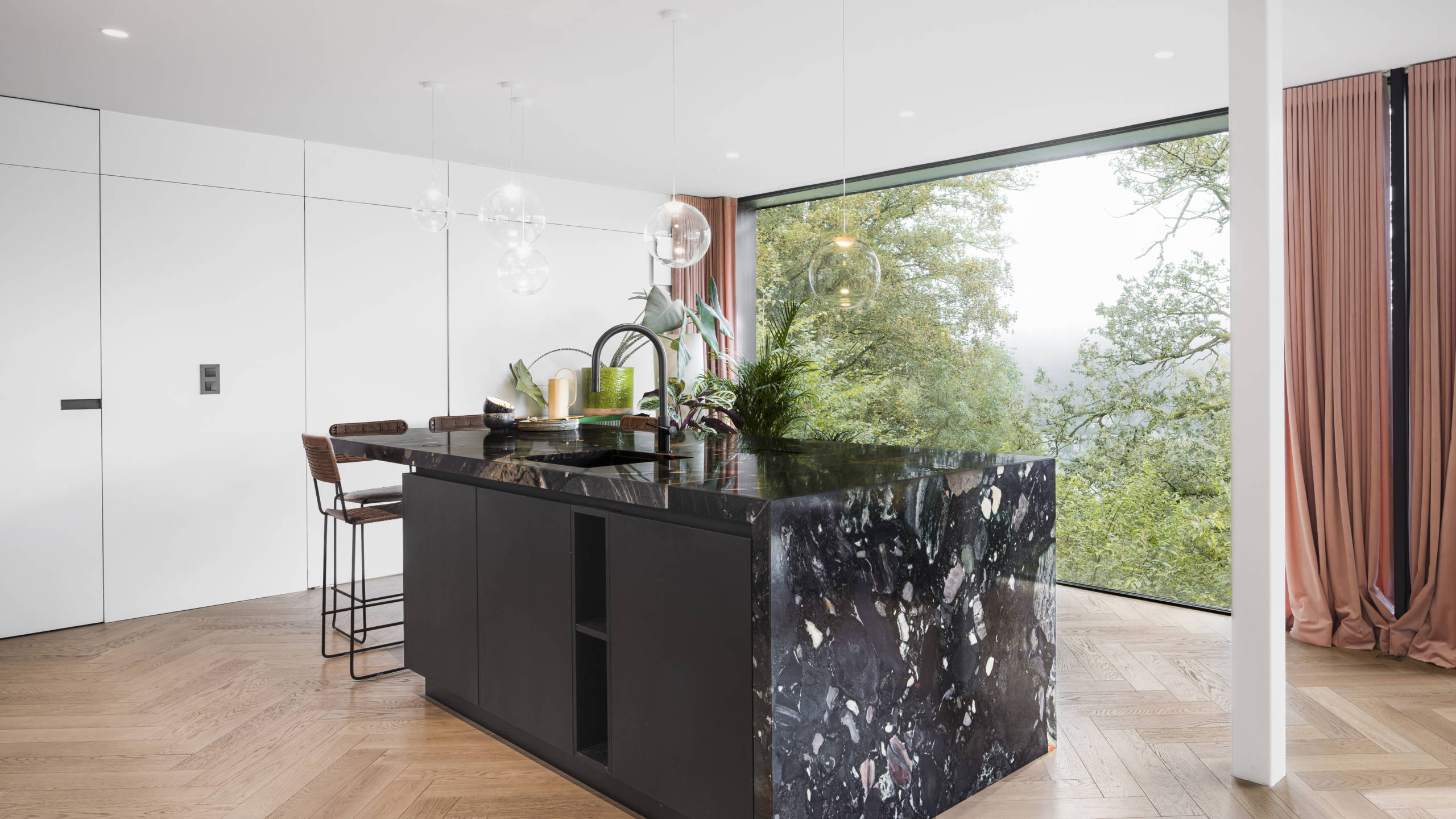 Le fond de pièce est habillé de lambris sur-mesure intégrant discrètement deux portes menant à d’autres espaces de la maison. Cet habillage boisé offre une continuité élégante et totalement épurée. L’ensemble crée une cuisine à la fois chaleureuse, intemporelle et portée par la précision technique.
