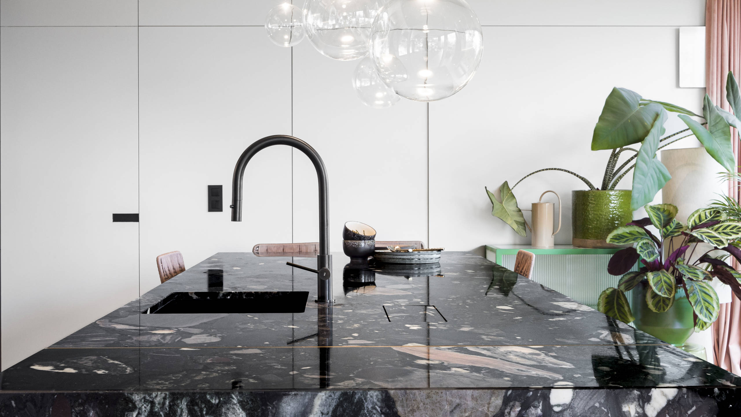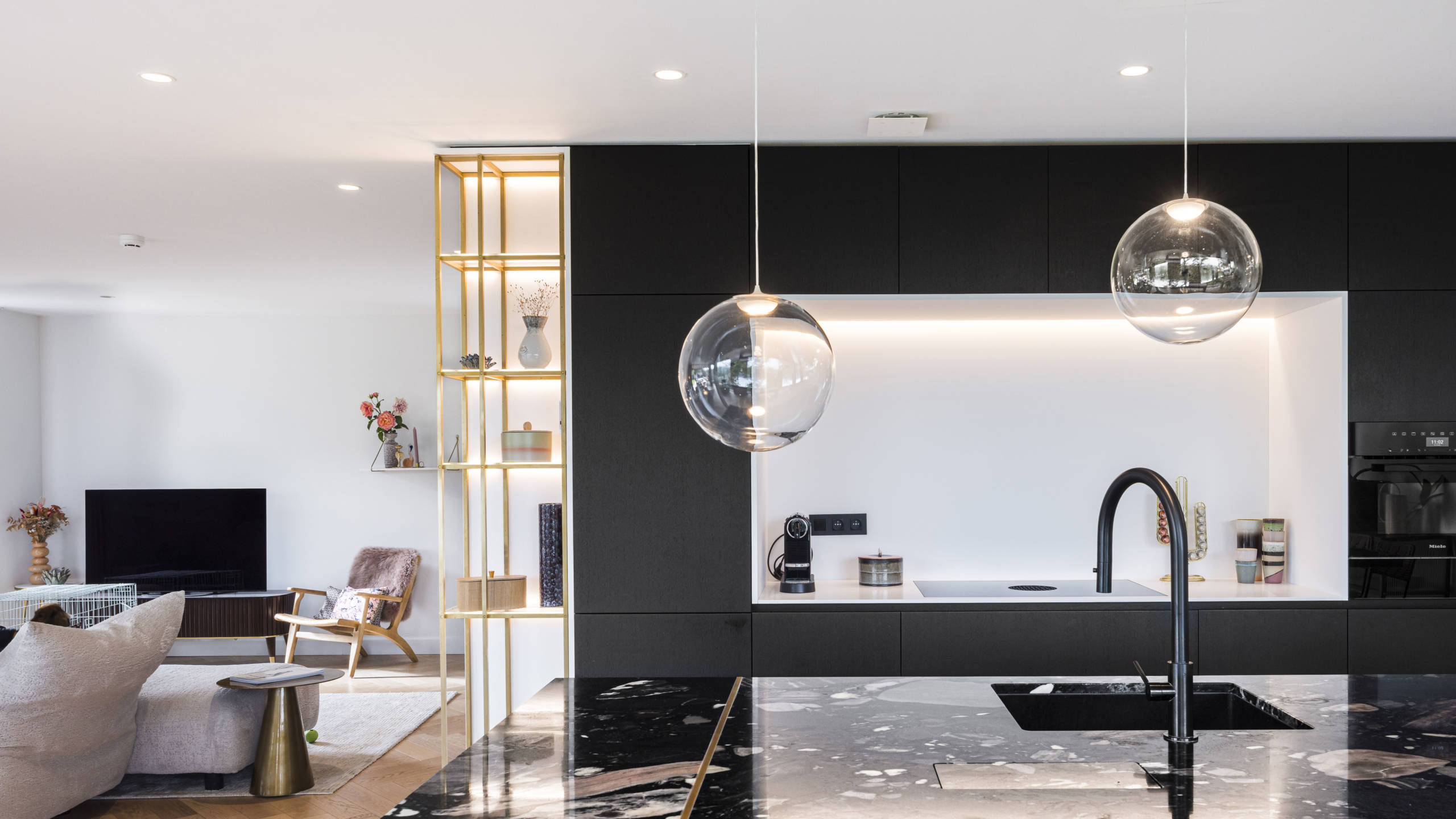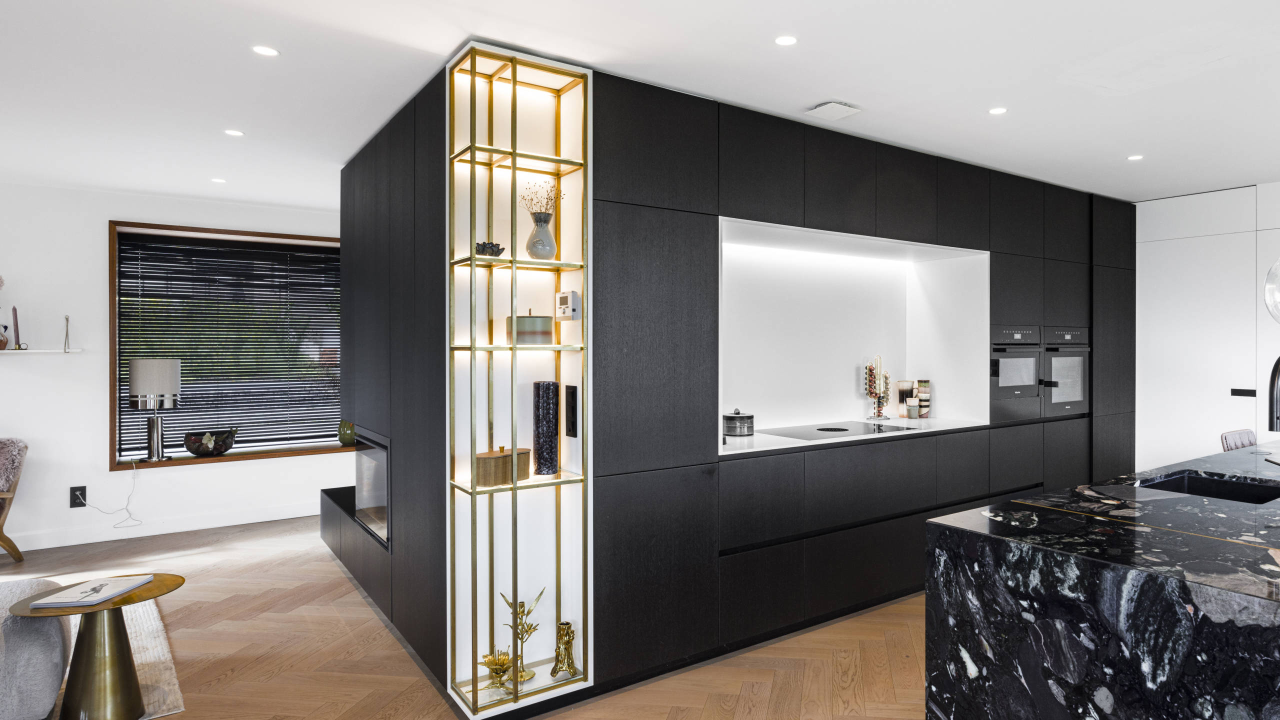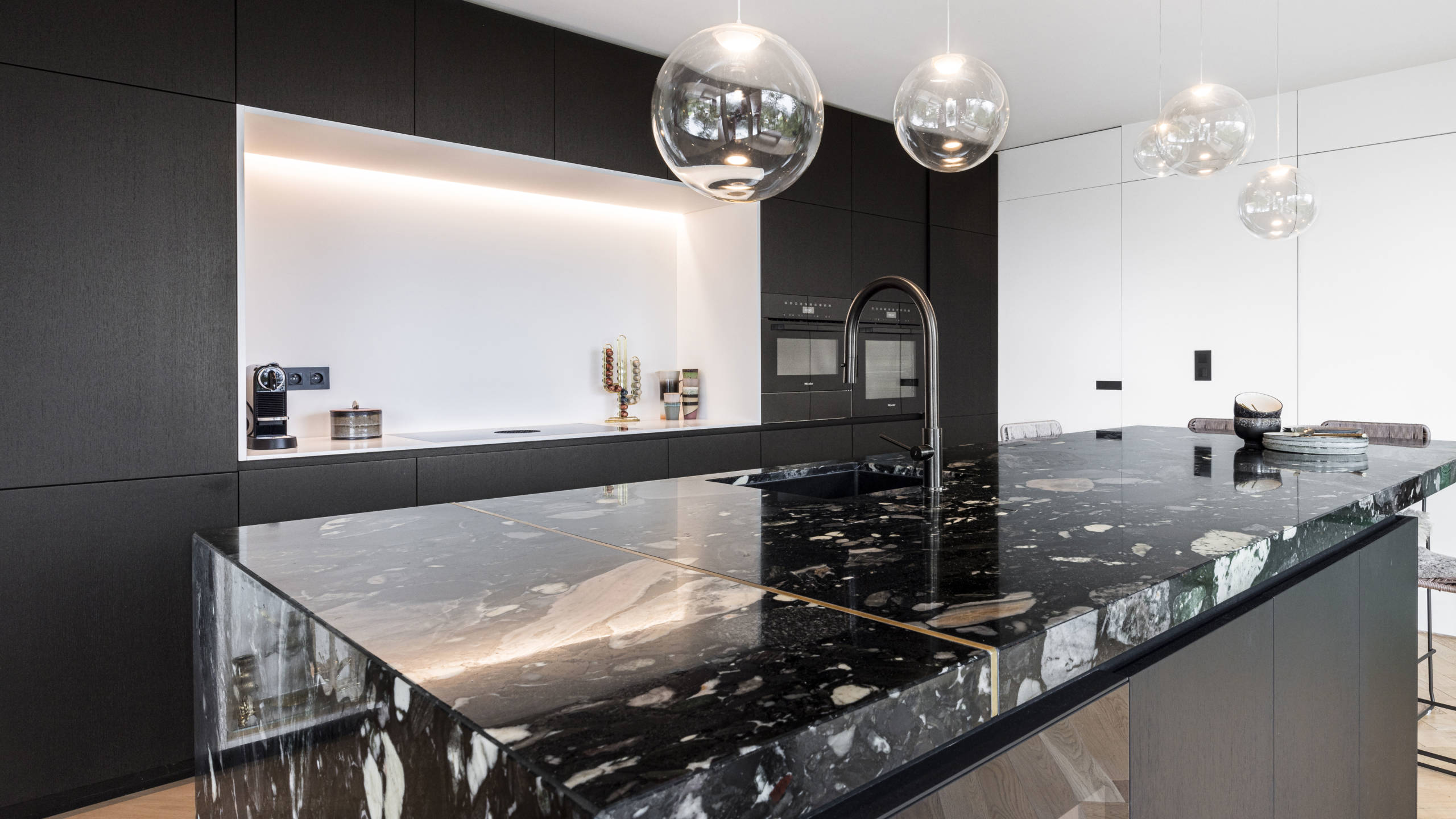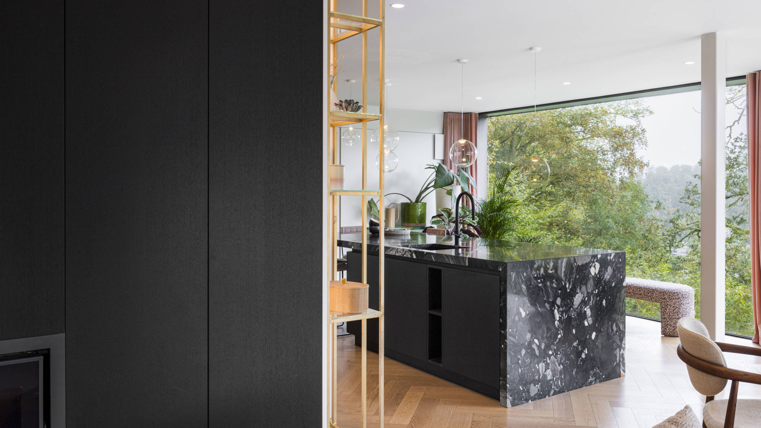 Dans cette cuisine, le sur-mesure s’exprime dans chaque détail. Le mobilier forme un bloc complet, intégrant les zones de cuisson, d’eau et de préparation. Le plan de travail en granit Cherry Black, d’une épaisseur généreuse, a été assemblé à 45°, avec des prises push-open directement intégrées dans la surface. Une pièce de jonction en laiton massif, incrustée dans le granit, fait écho à l’étagère en laiton sur-mesure éclairée, qui structure visuellement le mur principal.