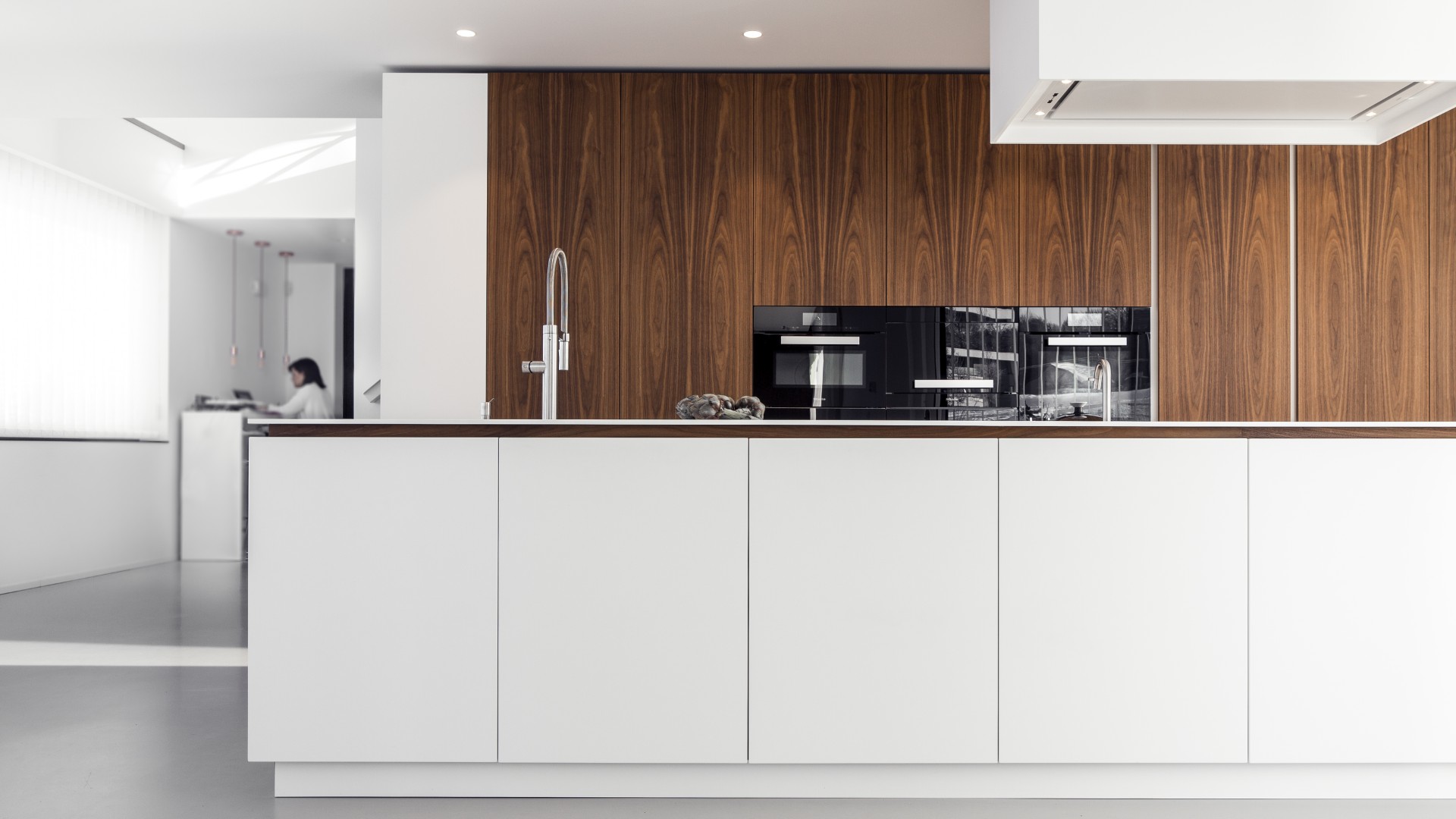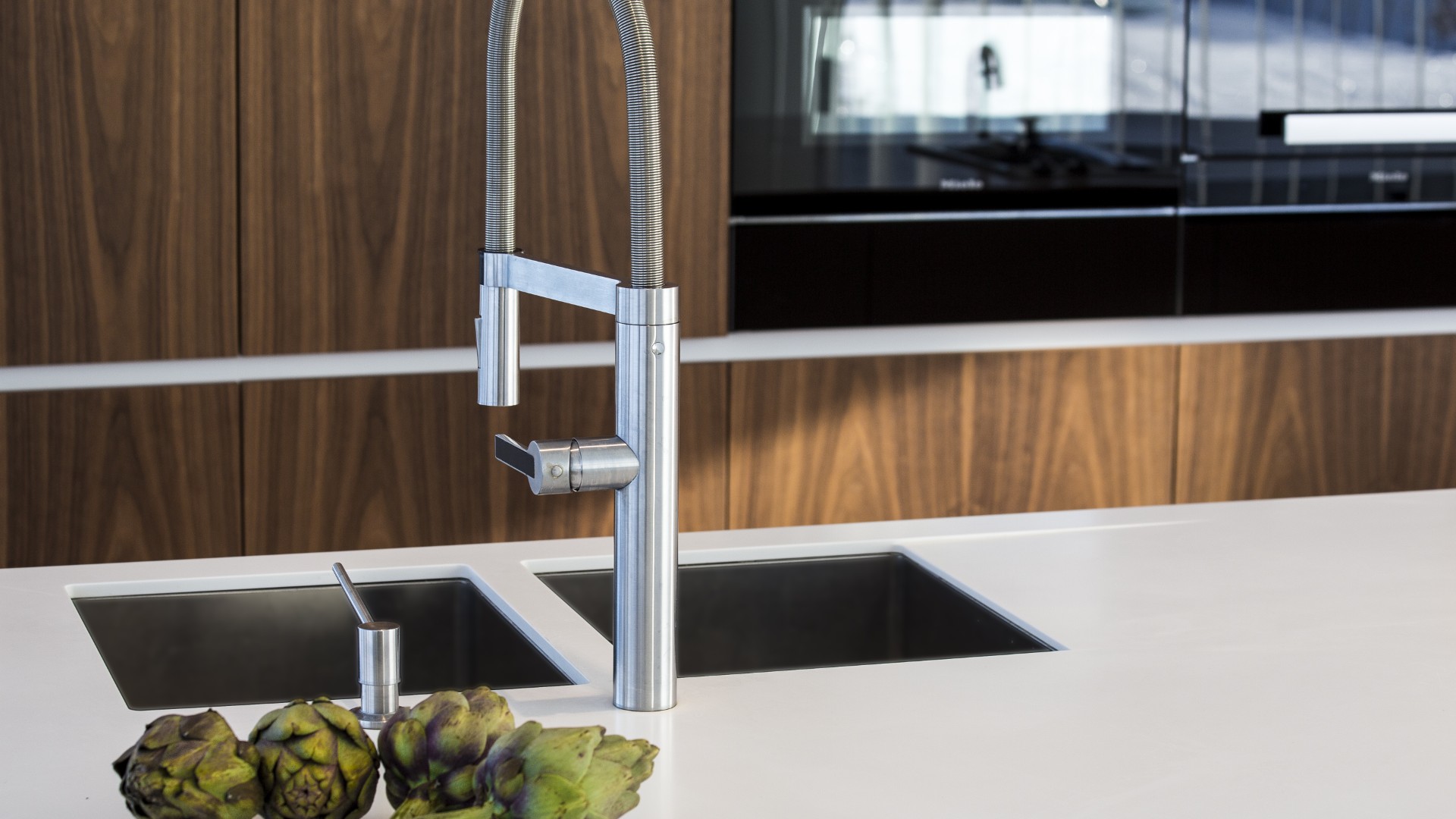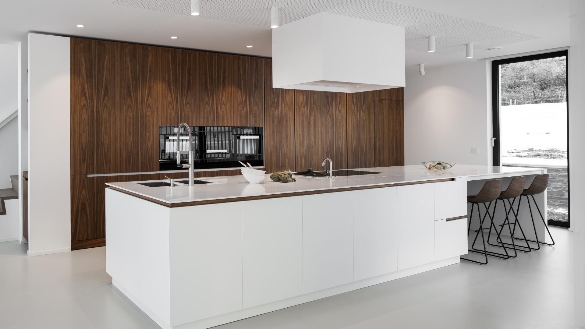 La cuisine s’articule autour d’un îlot exceptionnel de 5,47 m sur 1,20 m, réalisé en corian avec intégration d’espace de rangement dissimulé : parfait pour y glisser les épices et les herbes, prêtes à être utilisées en cuisinant. Un cuiseur vapeur, équipé de son robinet indépendant, complète l’équipement particulier. Le mobilier en noyer américain se prolonge sur près de 7m en formant un lambris qui dissimule placards et porte, assurant une continuité parfaitement fluide.
