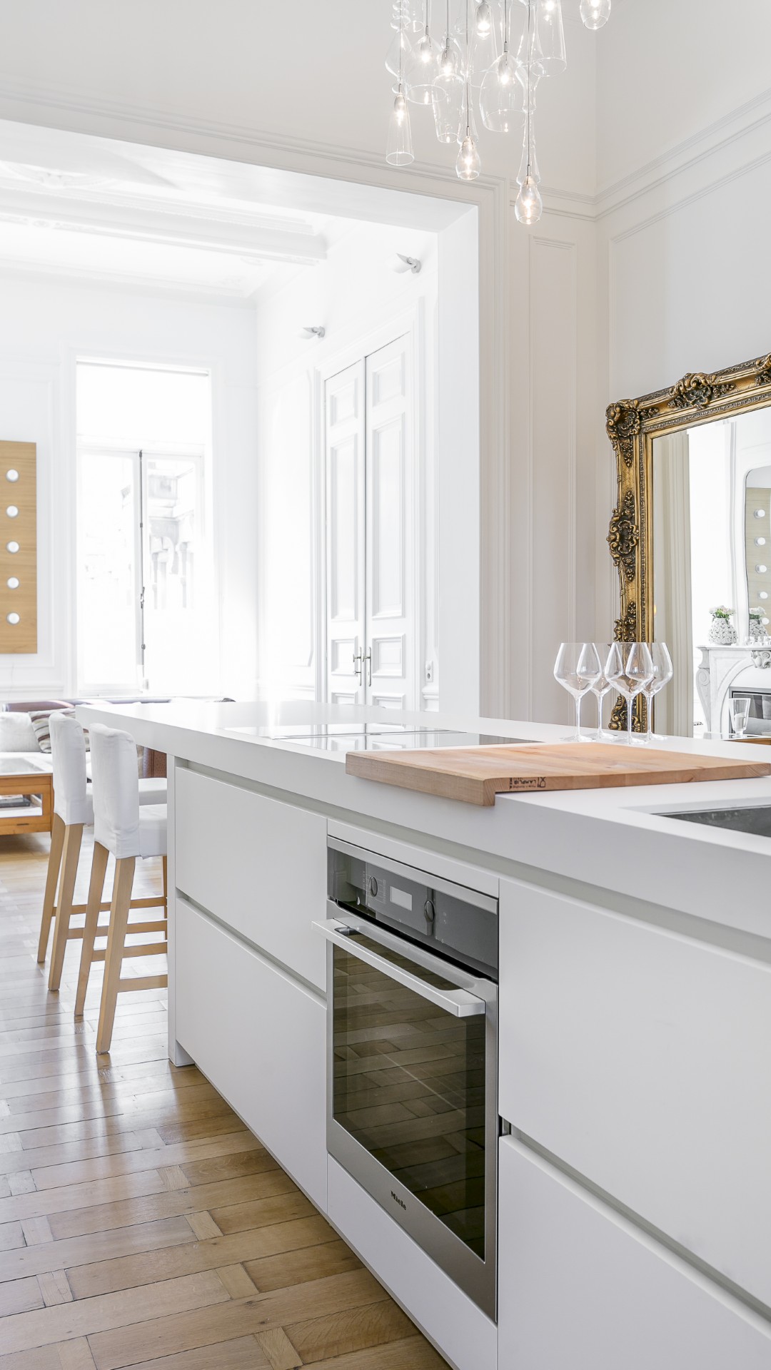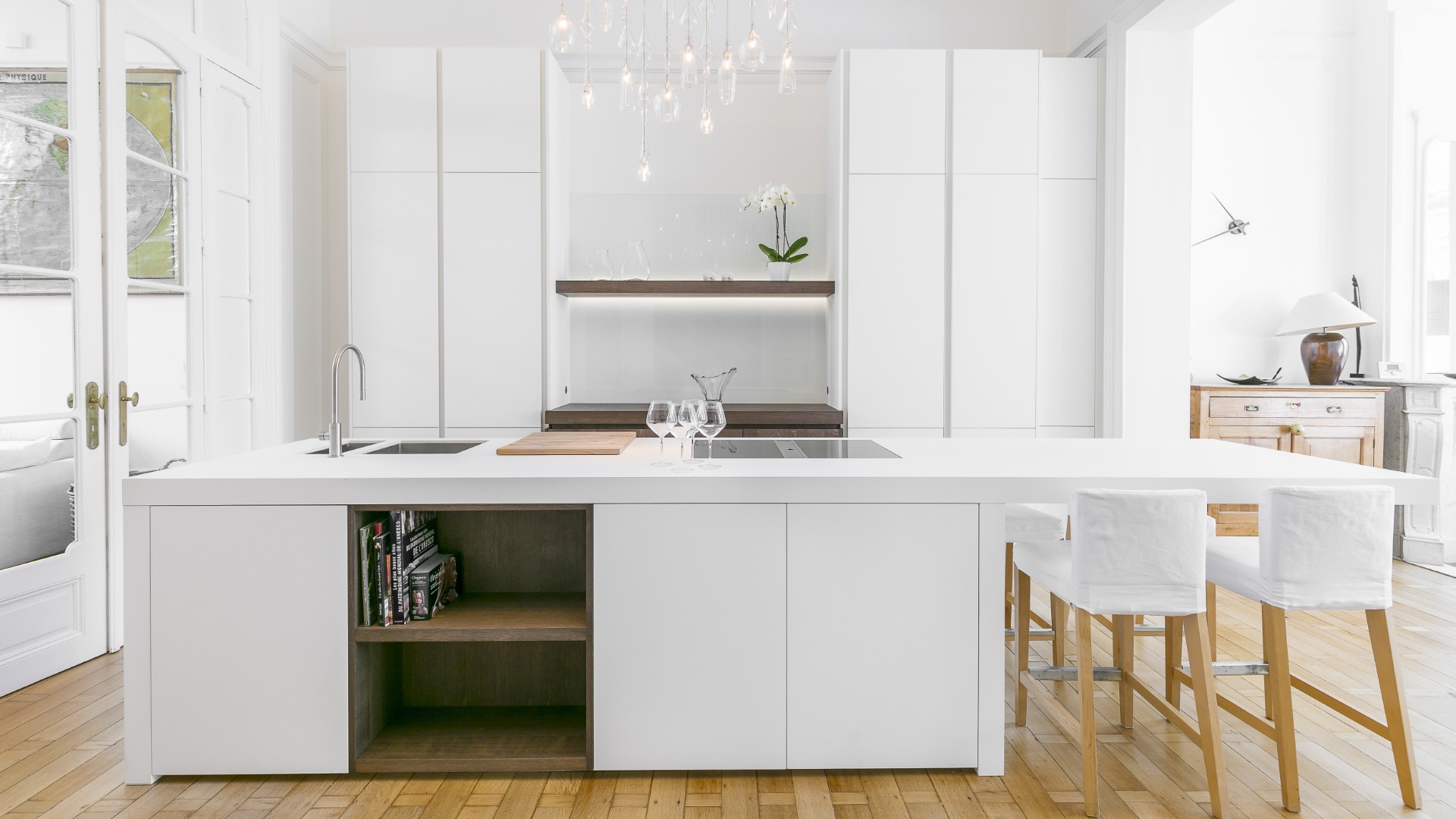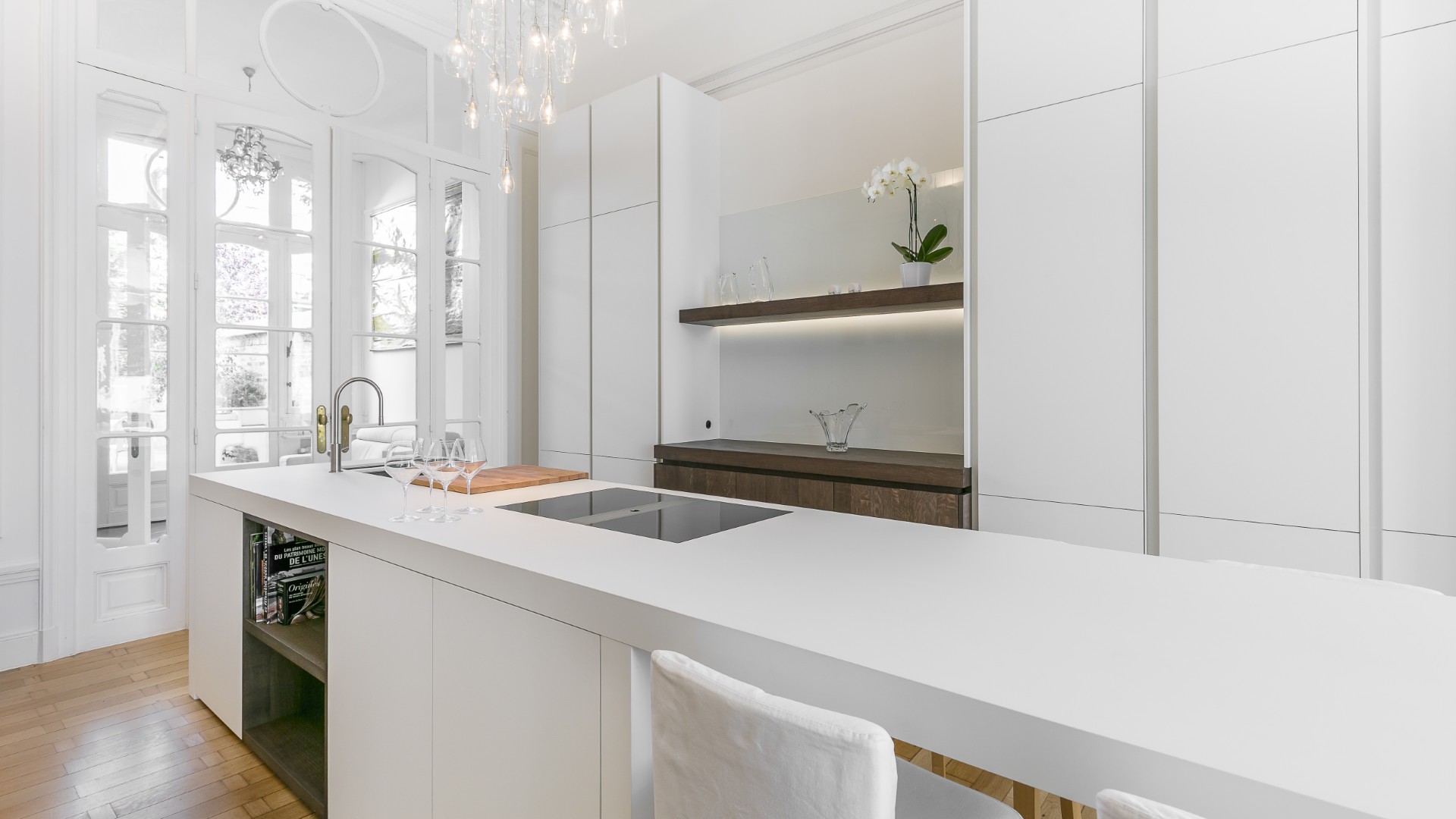 Le mobilier, réalisé en blanc intégral, adopte des lignes pures et des finitions impeccables. Le plan de travail en stratifié massif blanc renforce cet esprit intemporel. Une zone en chêne teinté apporte une touche chaleureuse et crée un lien subtil avec le parquet ancien.