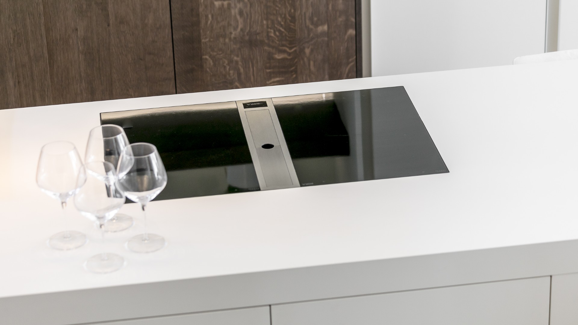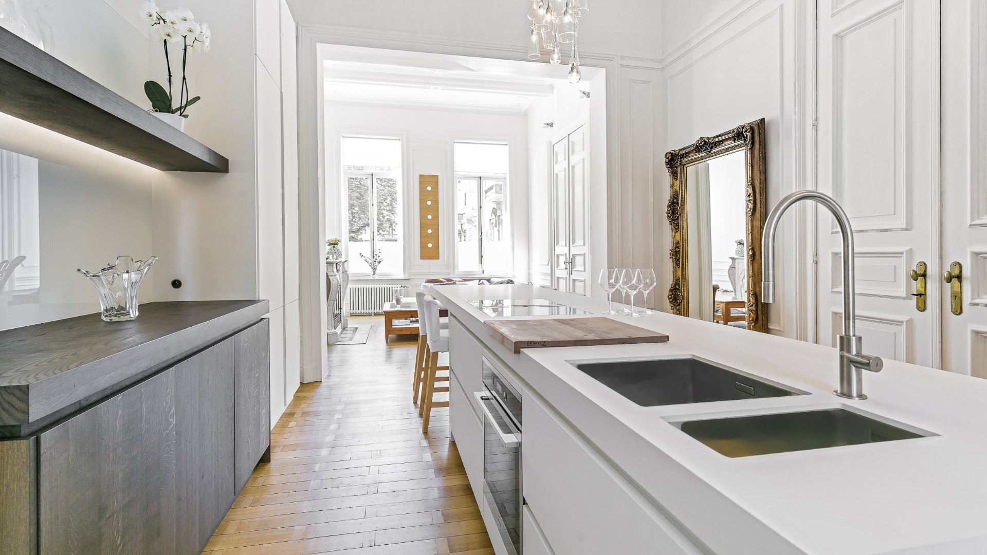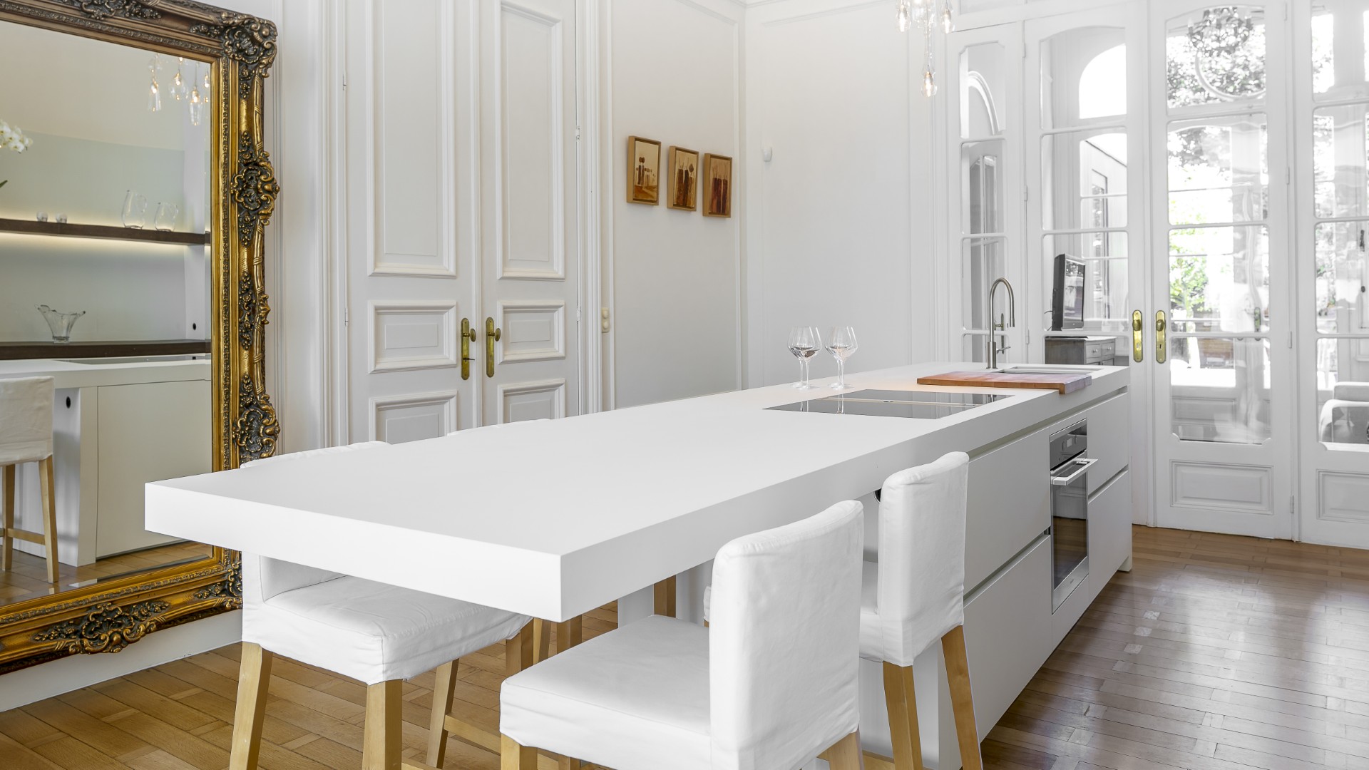 Le mobilier, réalisé en blanc intégral, adopte des lignes pures et des finitions impeccables. Le plan de travail en stratifié massif blanc renforce cet esprit intemporel. Une zone en chêne teinté apporte une touche chaleureuse et crée un lien subtil avec le parquet ancien.