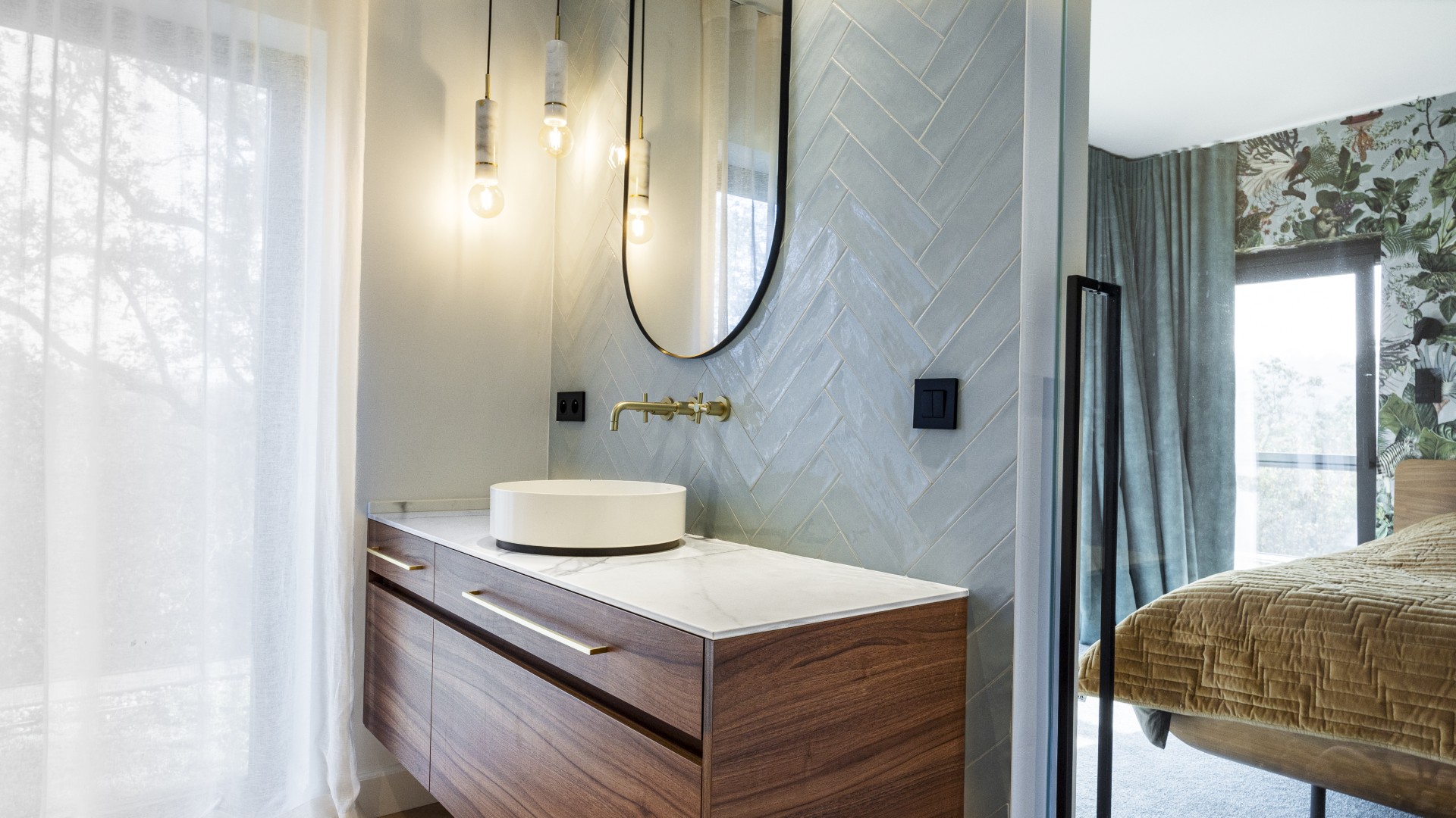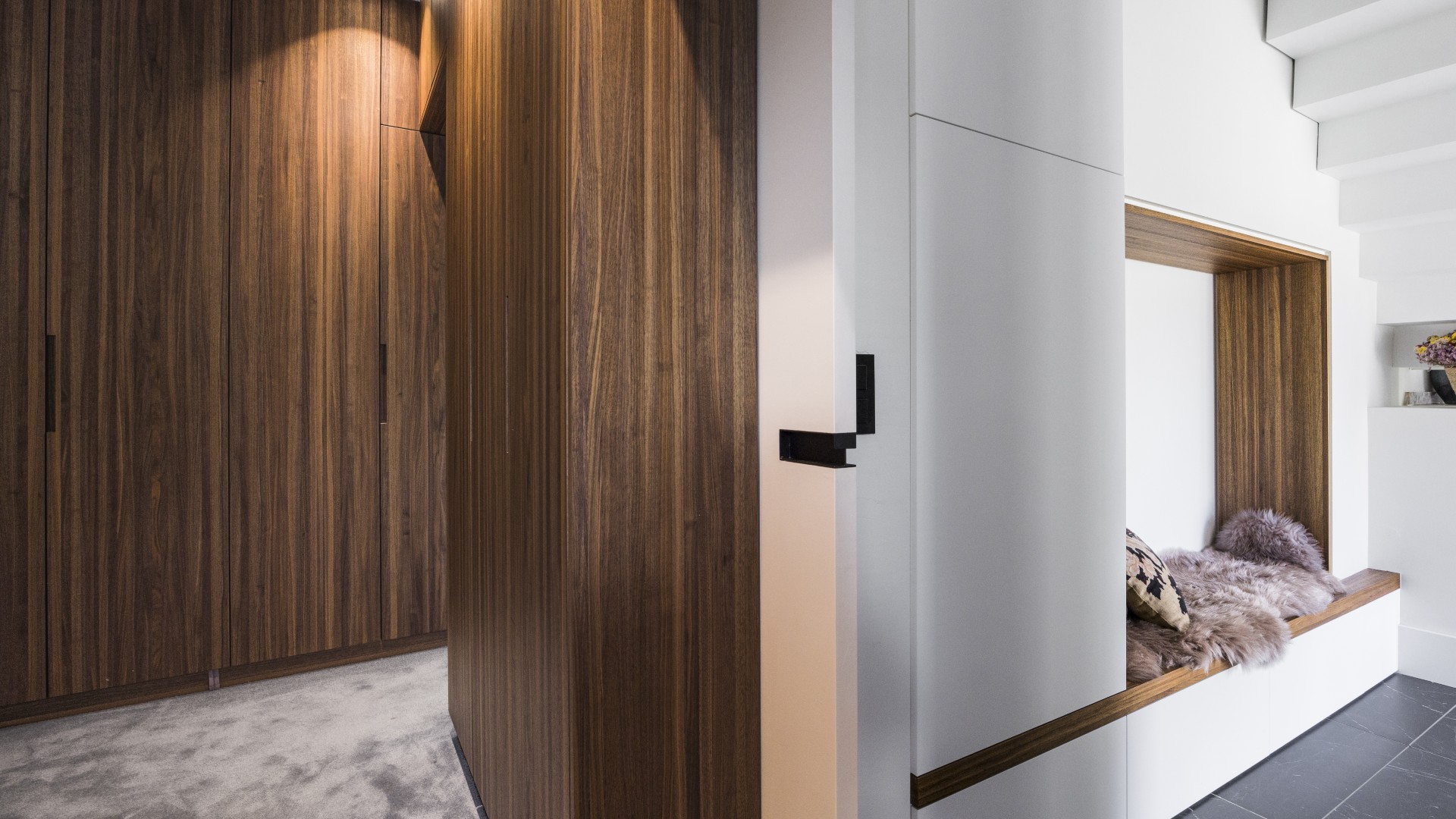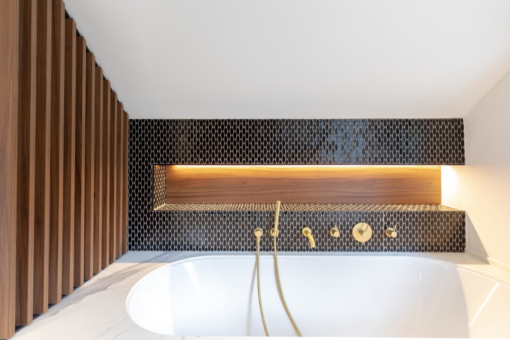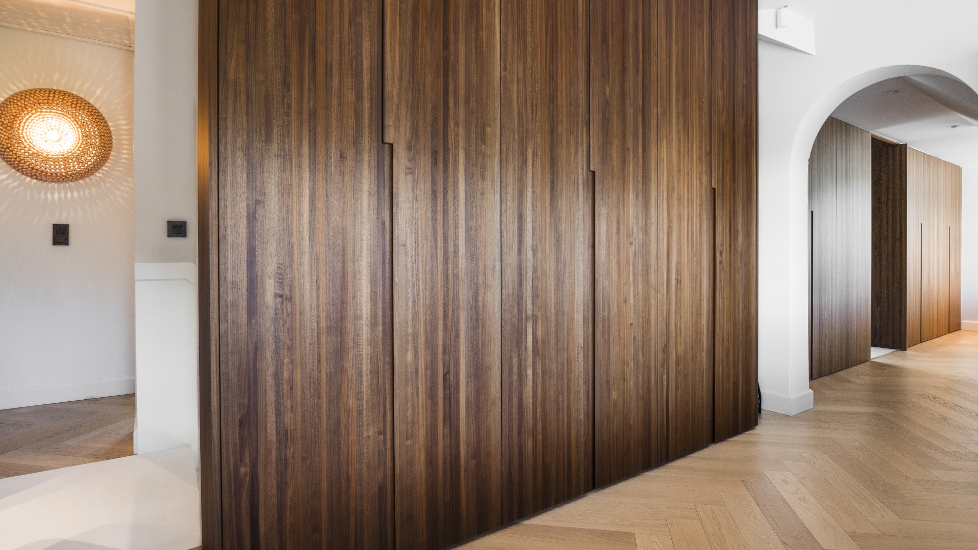 Le hall d’entrée a été repensé avec une banquette intégrée, un lambris sur-mesure et des rangements. La salle de bain, quant à elle, a été travaillée avec du noyer et du corian blanc, créant un contraste chaleureux et contemporain. Le carrelage à touches vintage et la robinetterie RVB apportent une personnalité supplémentaire à l’ensemble.