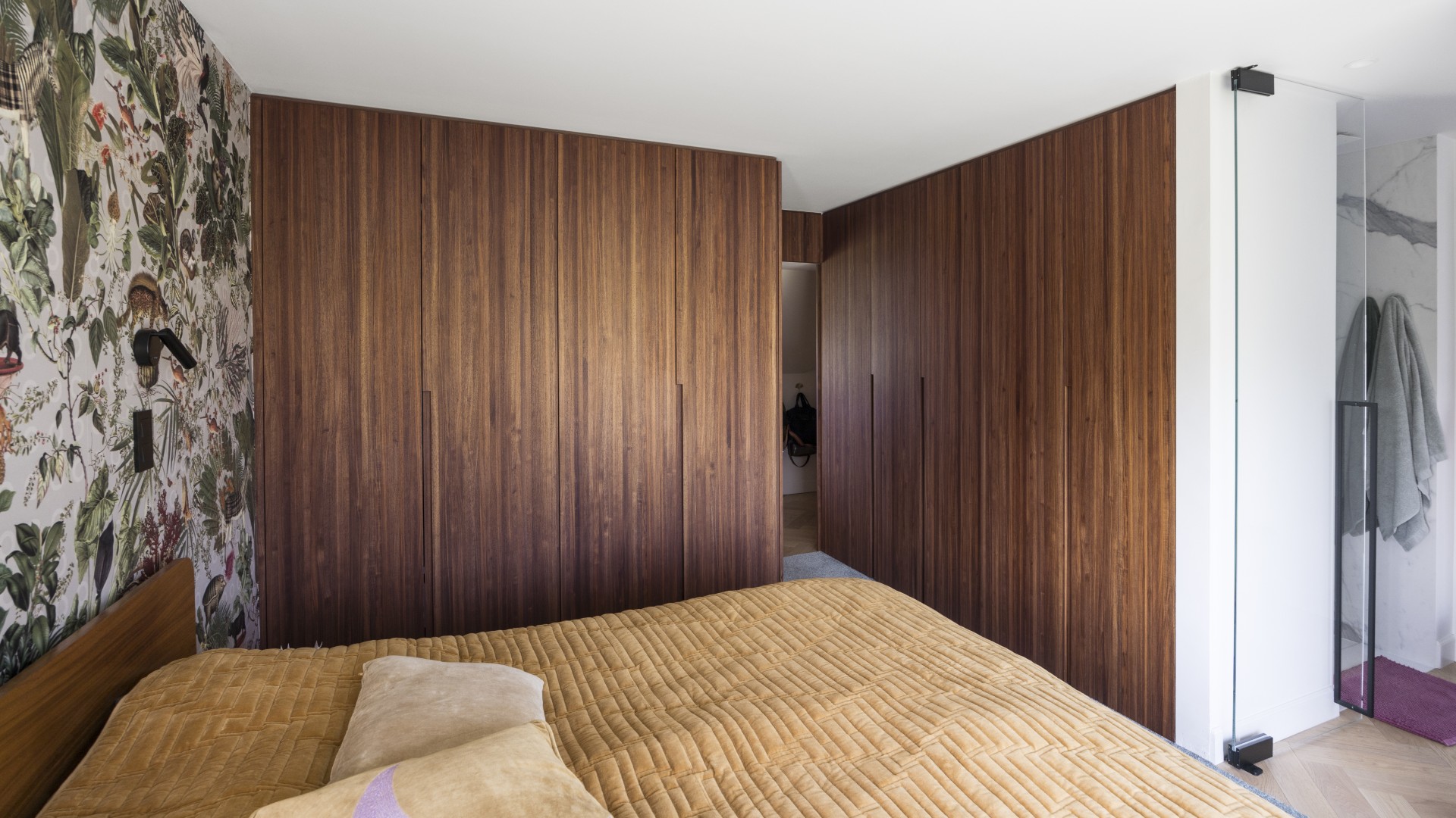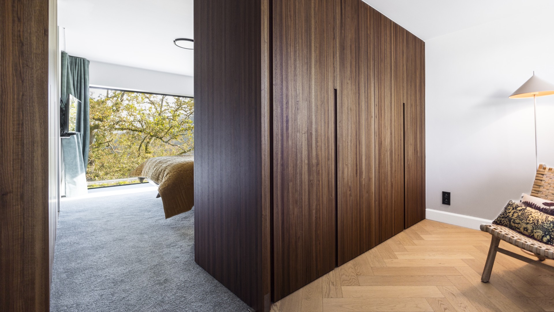 La pièce bénéficie d’une continuité forte entre la baignoire et le mobilier, pour un rendu sobre et parfaitement intégré malgré un travail technique exigeant. Pour la zone nuit, nous avons réalisé des placards et un dressing en mélèze fumé, avec poignées directement intégrées dans l’épaisseur des portes, alliant discrétion et élégance.