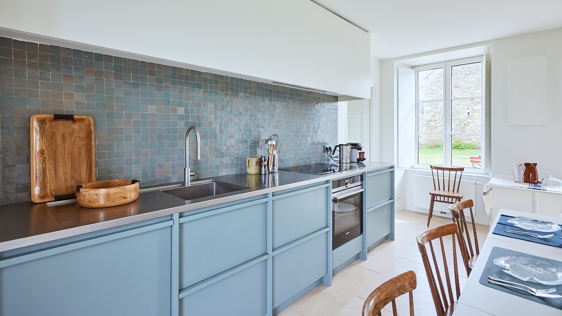Nous avons imaginé une cuisine lumineuse et conviviale, travaillée en chêne laqué bleu-vert, en rappel direct des zéliges du mur. Le plan de travail en inox, choisi pour sa robustesse et sa facilité d’entretien, intègre un évier soudé pour un rendu parfaitement homogène.
