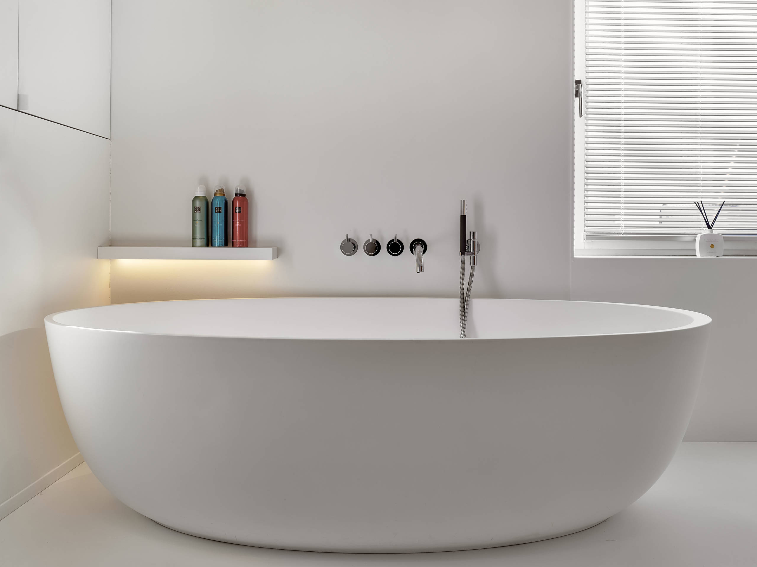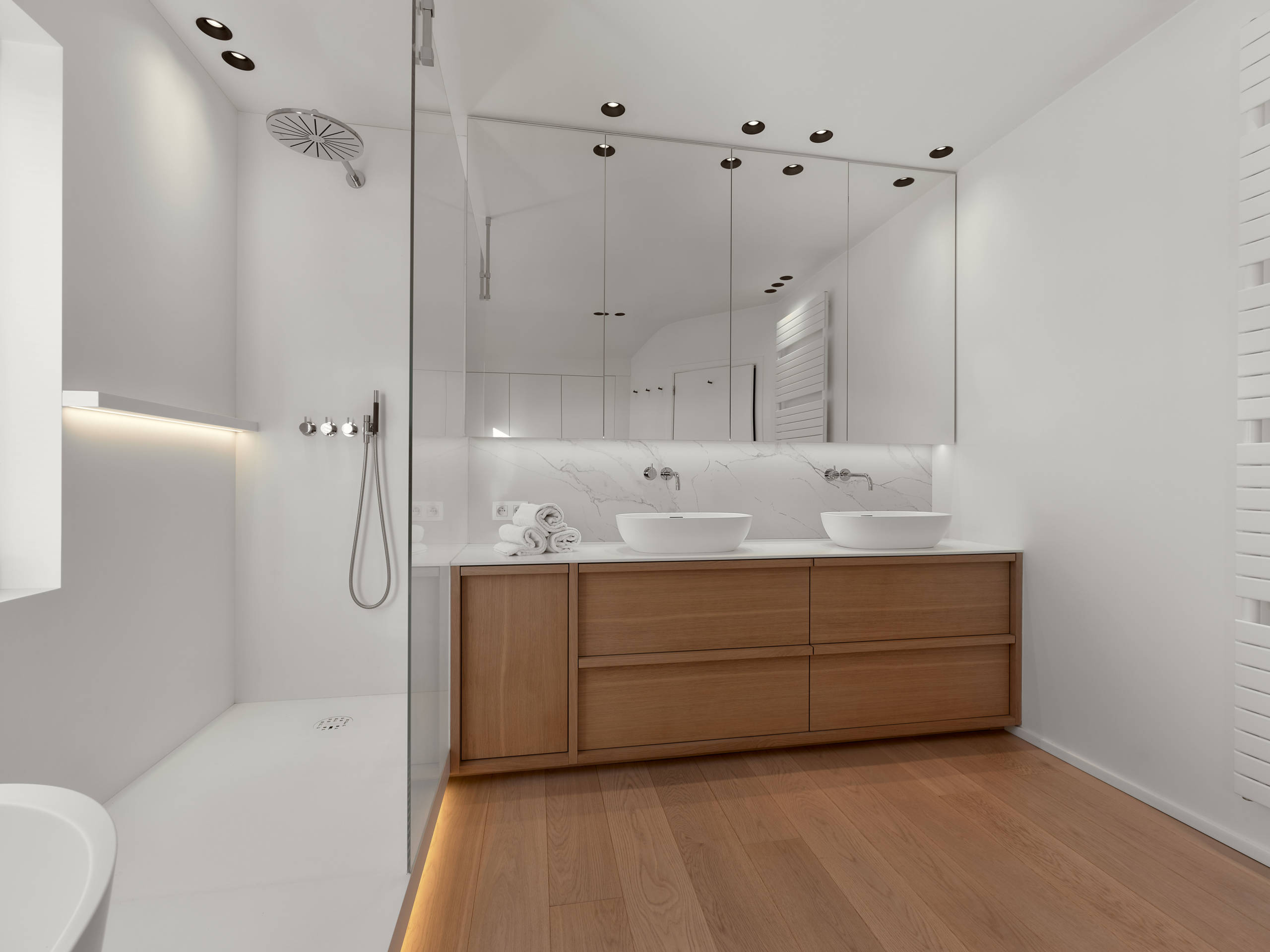 Nous l’avons réalisé à l’aide de cloisons techniques, d’une estrade pour dissimuler les arrivées et évacuations d’eau. Sur cette estrade en hauteur réalisée sur-mesure repose la baignoire. Les matériaux choisis, chêne, marbre et corian, apportent modernité et durabilité à l’espace.