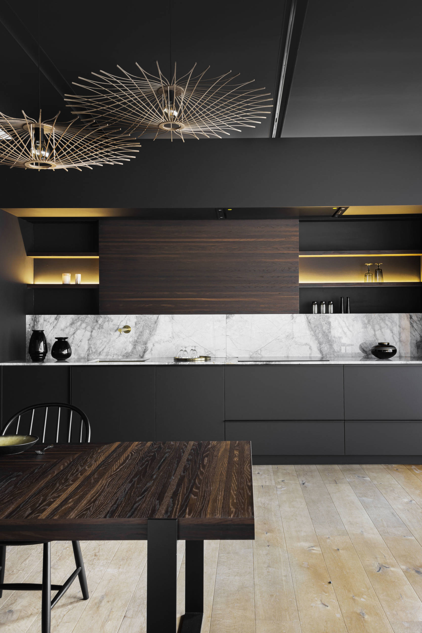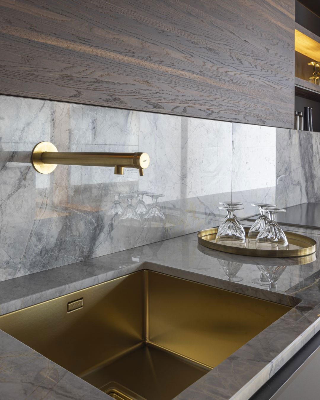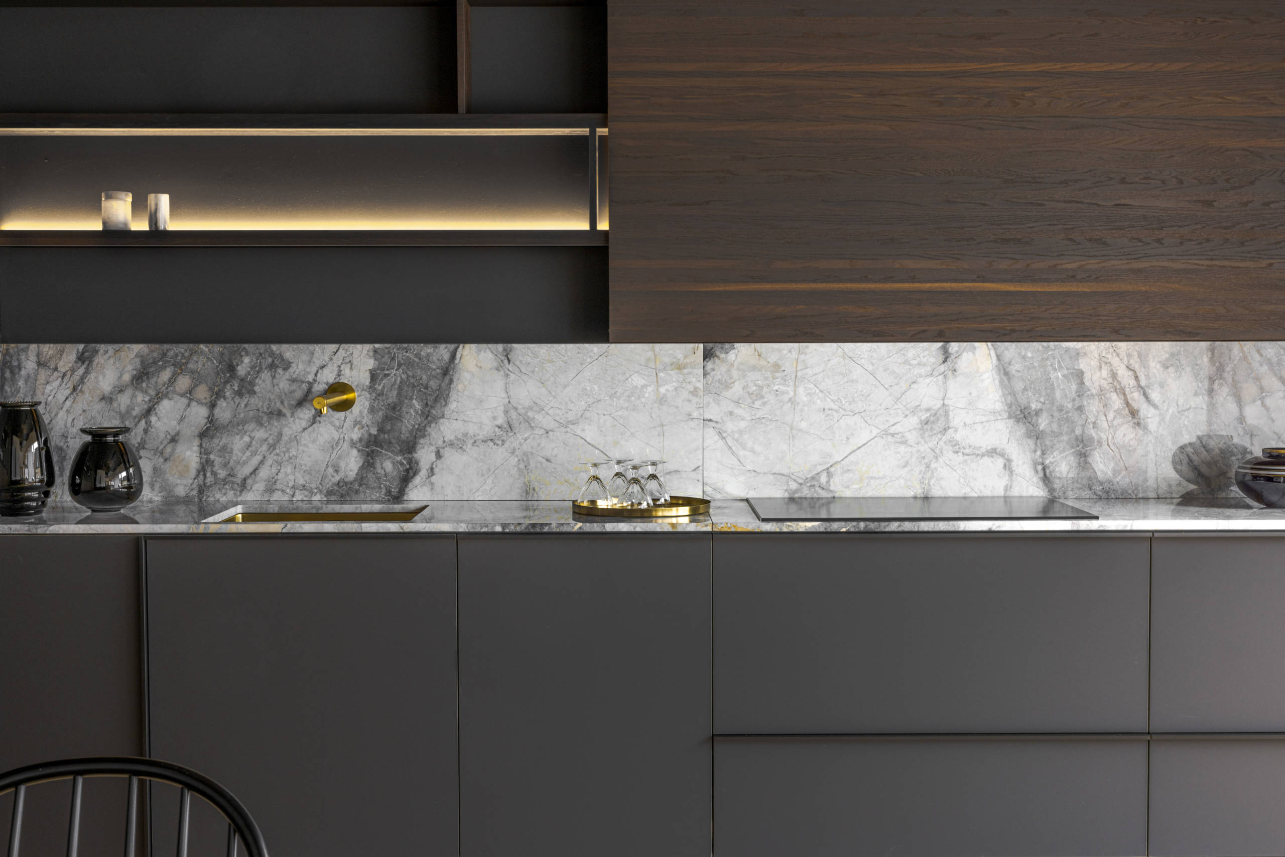 Cet espace comporte un mariage d’ombre et de lumière. Côté foncé, on retrouve l’alliance de beaux matériaux comme le fénix noir et le chêne fumé. Les étagères et rangements sur-mesure incluent une porte coulissante ainsi qu’un coin à manger, parfaitement connecté avec la table. Le plan de travail en marbre et la robinetterie et les éviers dorés apportent lumière et cohérence à l’ensemble.