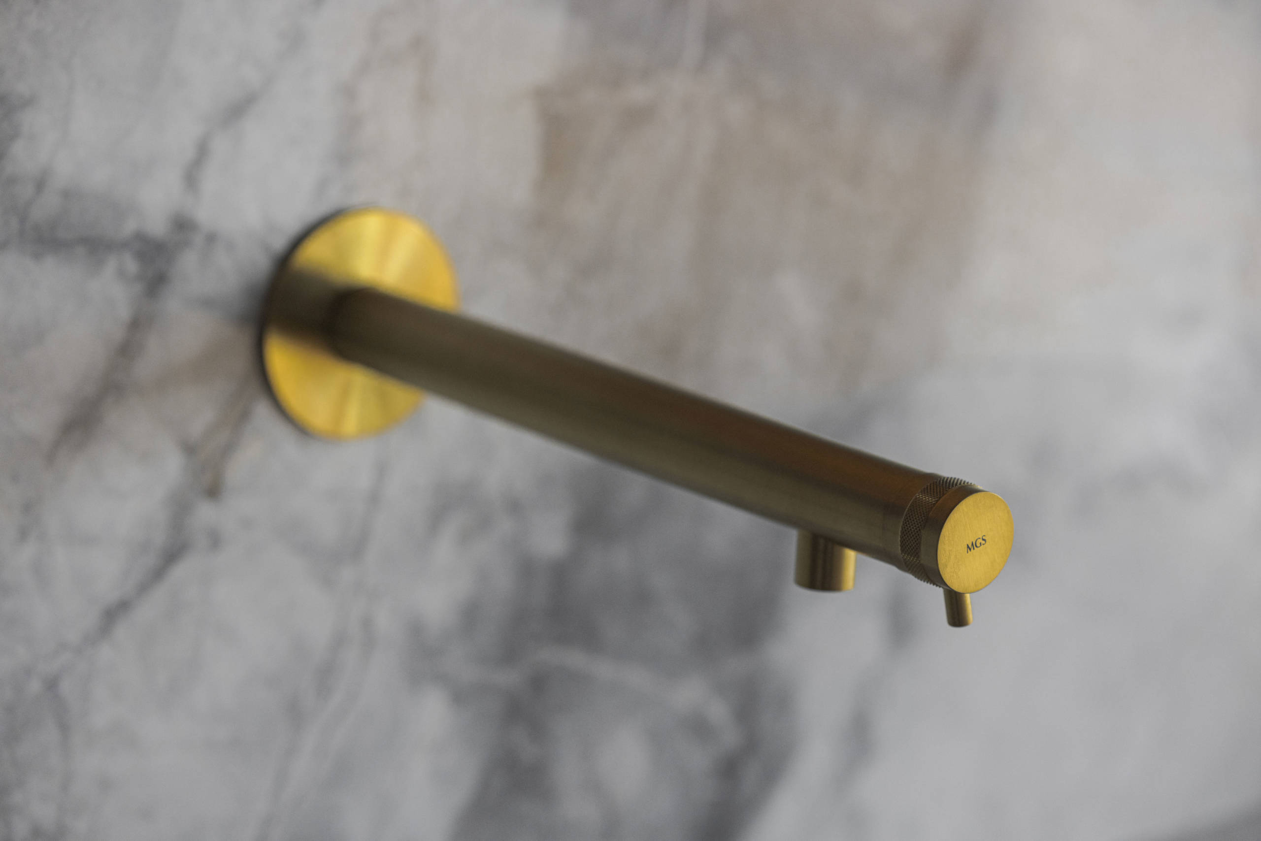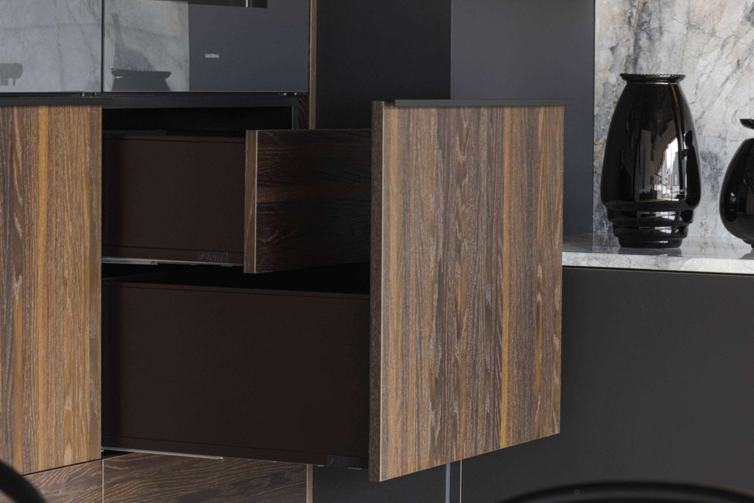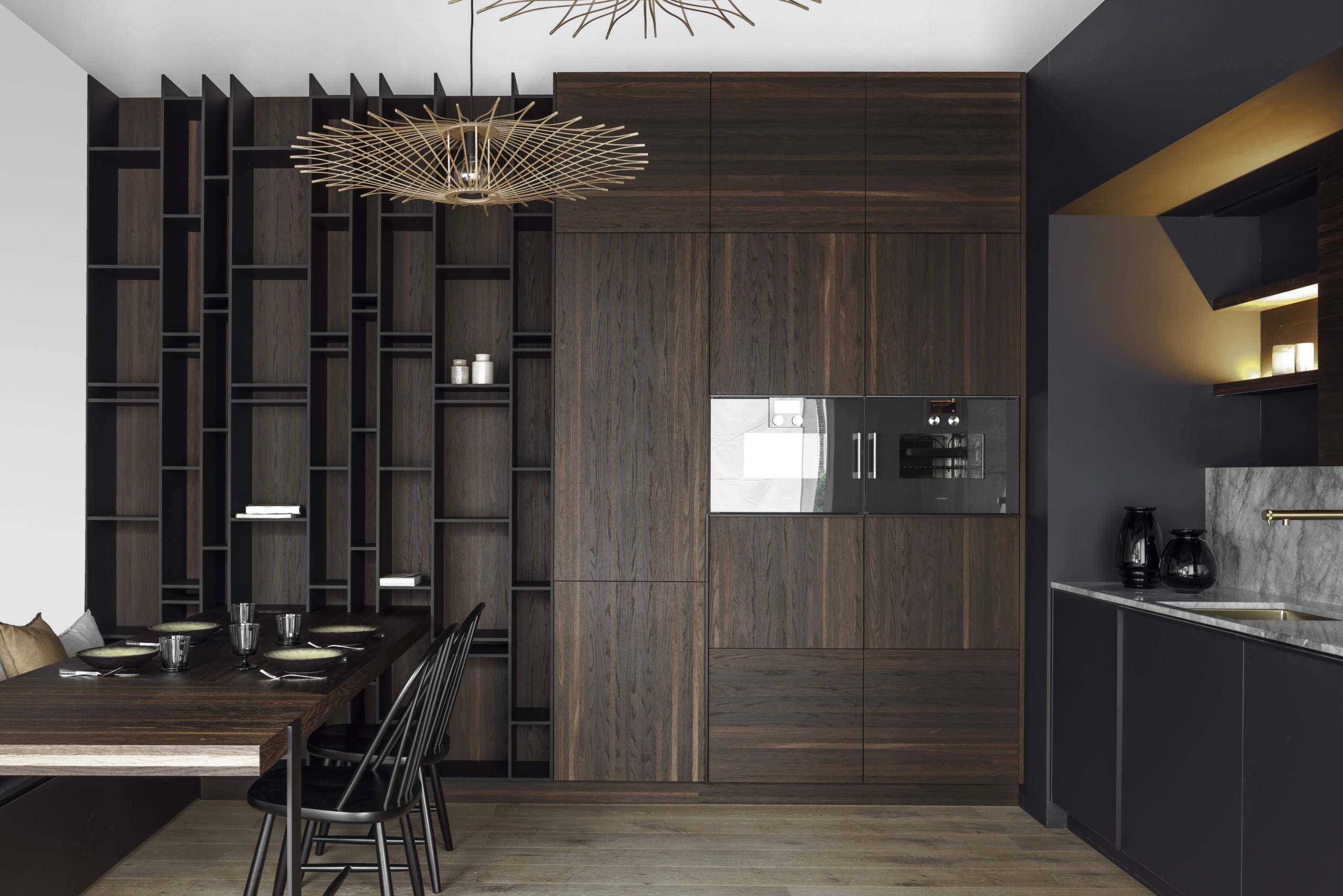 Cet espace comporte un mariage d’ombre et de lumière. Côté foncé, on retrouve l’alliance de beaux matériaux comme le fénix noir et le chêne fumé. Les étagères et rangements sur-mesure incluent une porte coulissante ainsi qu’un coin à manger, parfaitement connecté avec la table. Le plan de travail en marbre et la robinetterie et les éviers dorés apportent lumière et cohérence à l’ensemble.