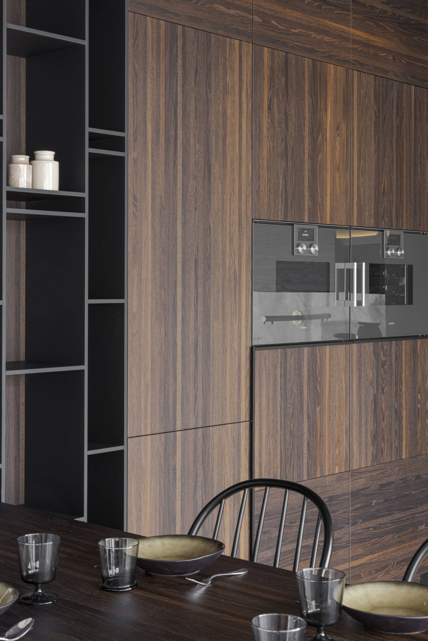 Ce projet figure dans notre salle d’exposition à Battice. Nous l’avons pensé comme une démonstration de notre travail sur-mesure, qui s’étend au-delà de la cuisine et comporte également l’intégration des étagères ou de la table à manger. Ce projet, que vous pouvez découvrir dans notre showroom, allie matières nobles et technicité.