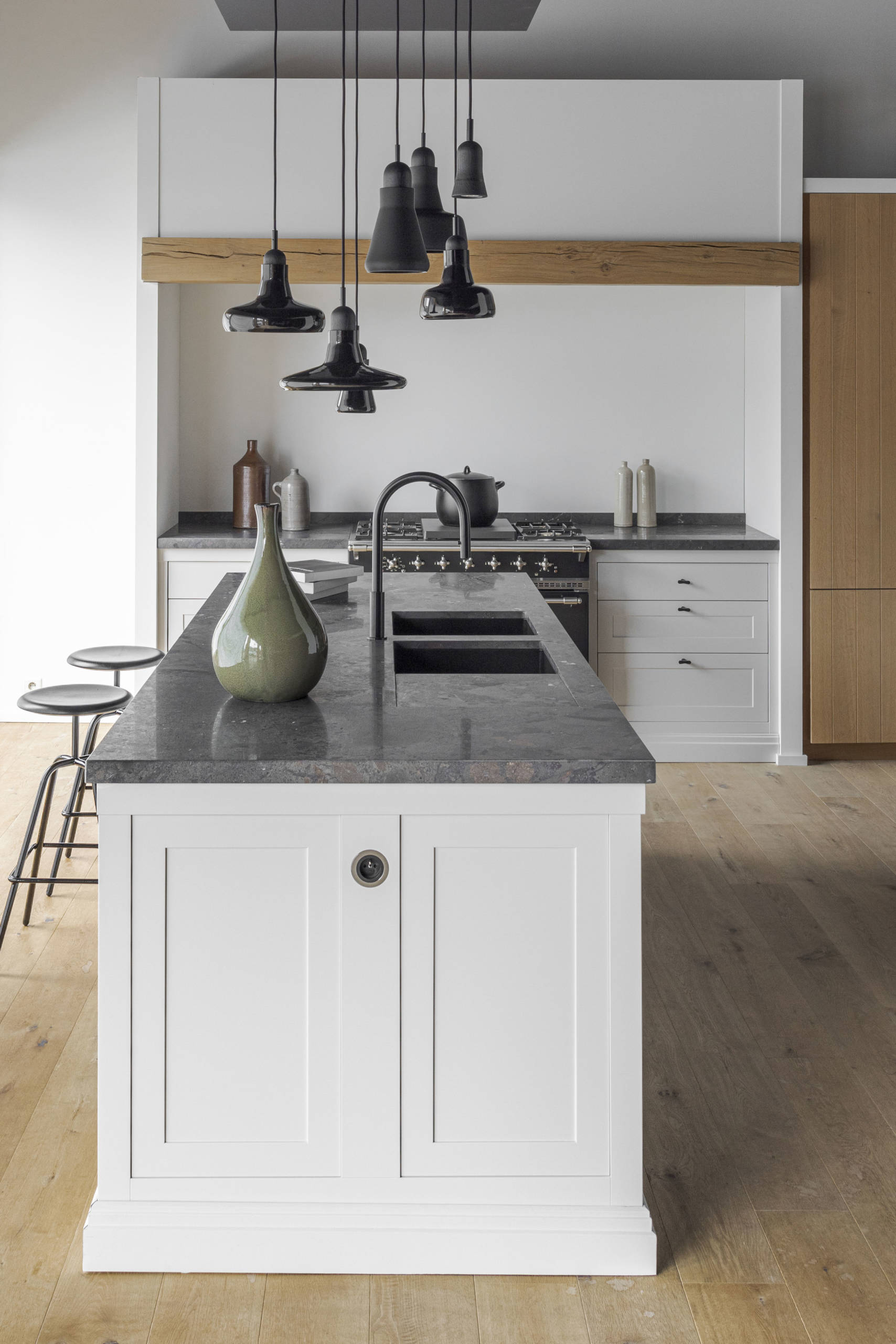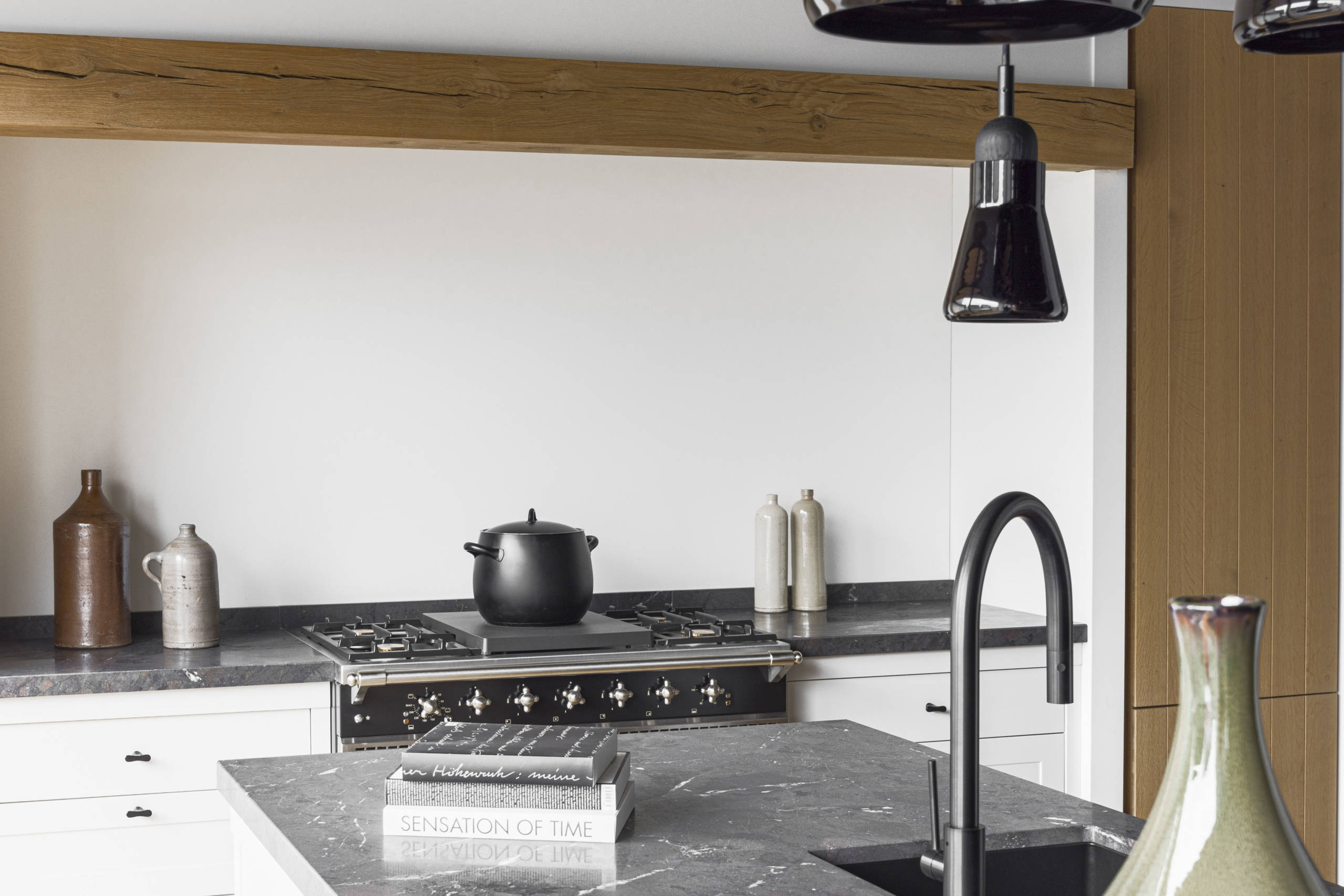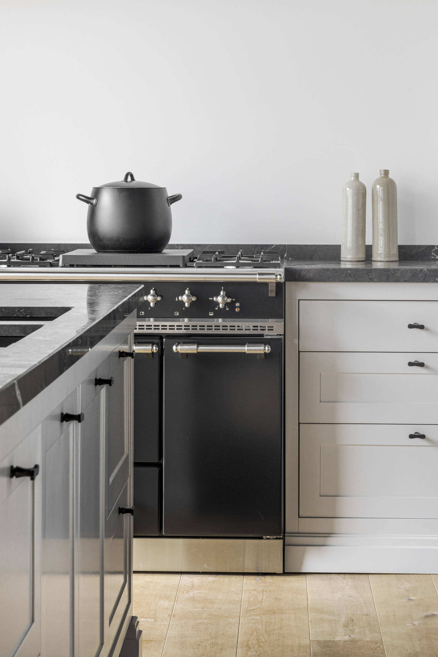 Les matériaux de cette cuisine marient charme traditionnel et accueil chaleureux. Le chêne massif est souligné par un mobilier classique laqué, des moulures, des châssis en acier noir… L’aspect cottage est souligné par une cuisinière traditionnelle Lacanche, ou encore par les carrés de ciment à la fois colorés et géométriques.