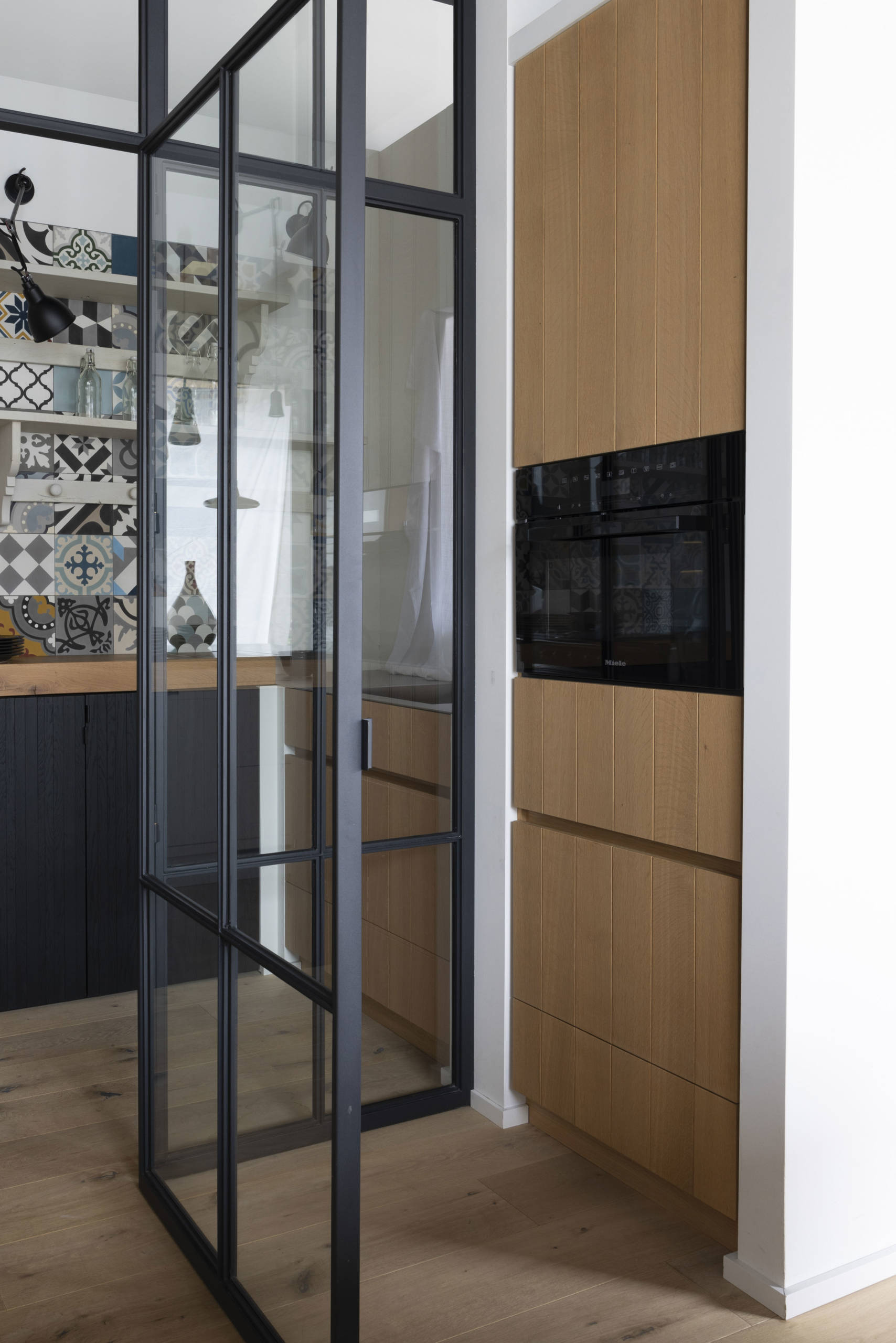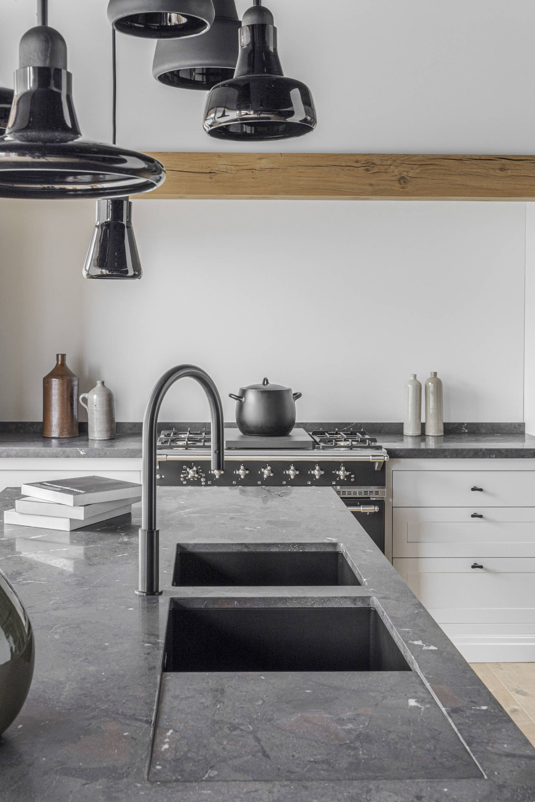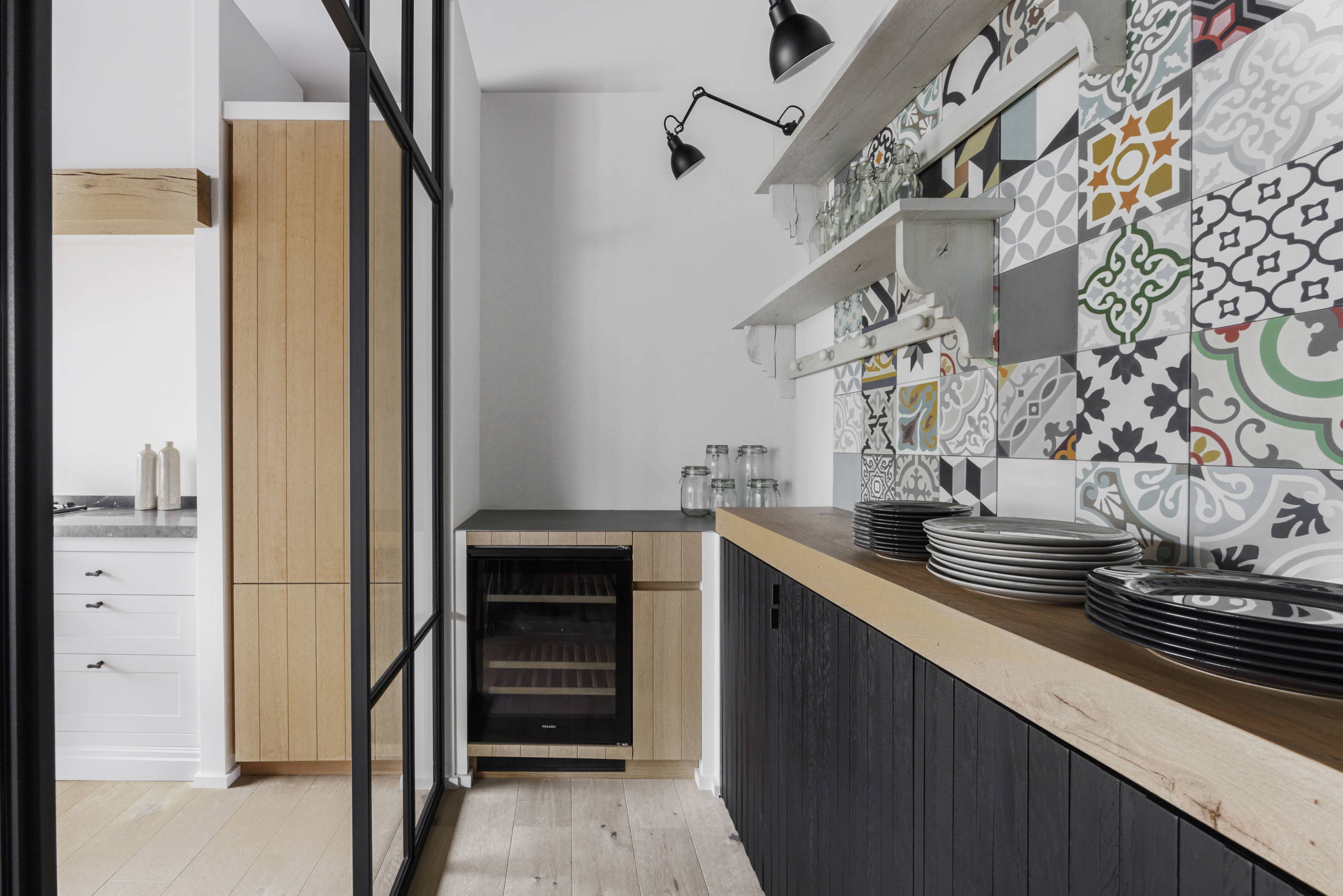 Les matériaux de cette cuisine marient charme traditionnel et accueil chaleureux. Le chêne massif est souligné par un mobilier classique laqué, des moulures, des châssis en acier noir… L’aspect cottage est souligné par une cuisinière traditionnelle Lacanche, ou encore par les carrés de ciment à la fois colorés et géométriques.